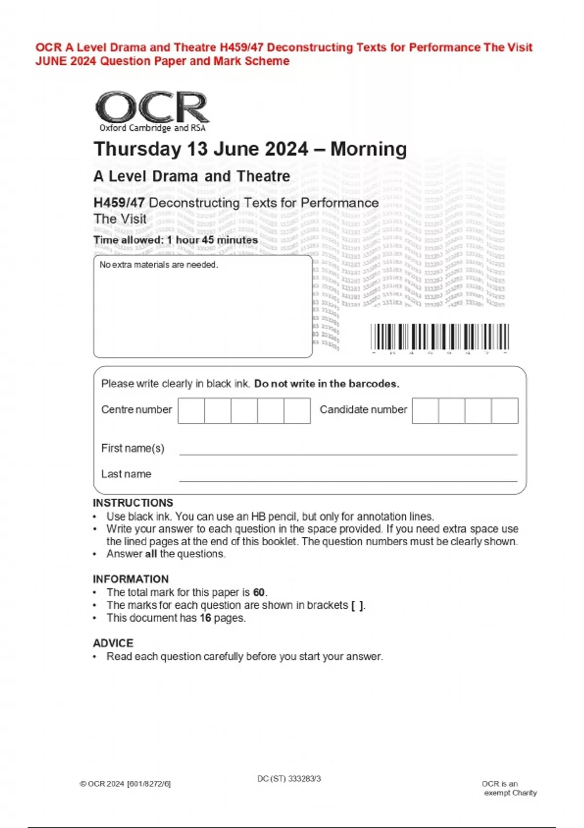 OCR A Level Drama and Theatre H459/47 Deconstructing Texts for Performance The Visit JUNE 2024 Question Paper and Mark Scheme