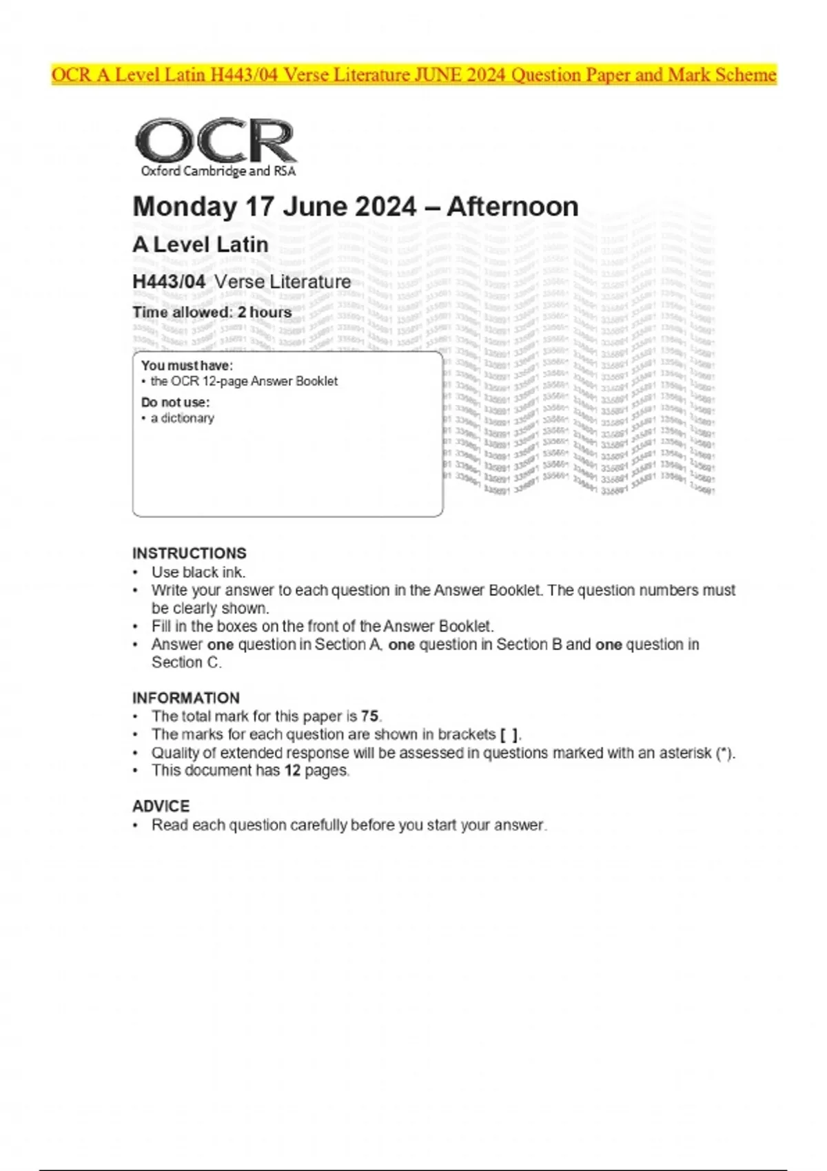 OCR A Level Latin H443/04 Verse Literature JUNE 2024 Question Paper and Mark Scheme