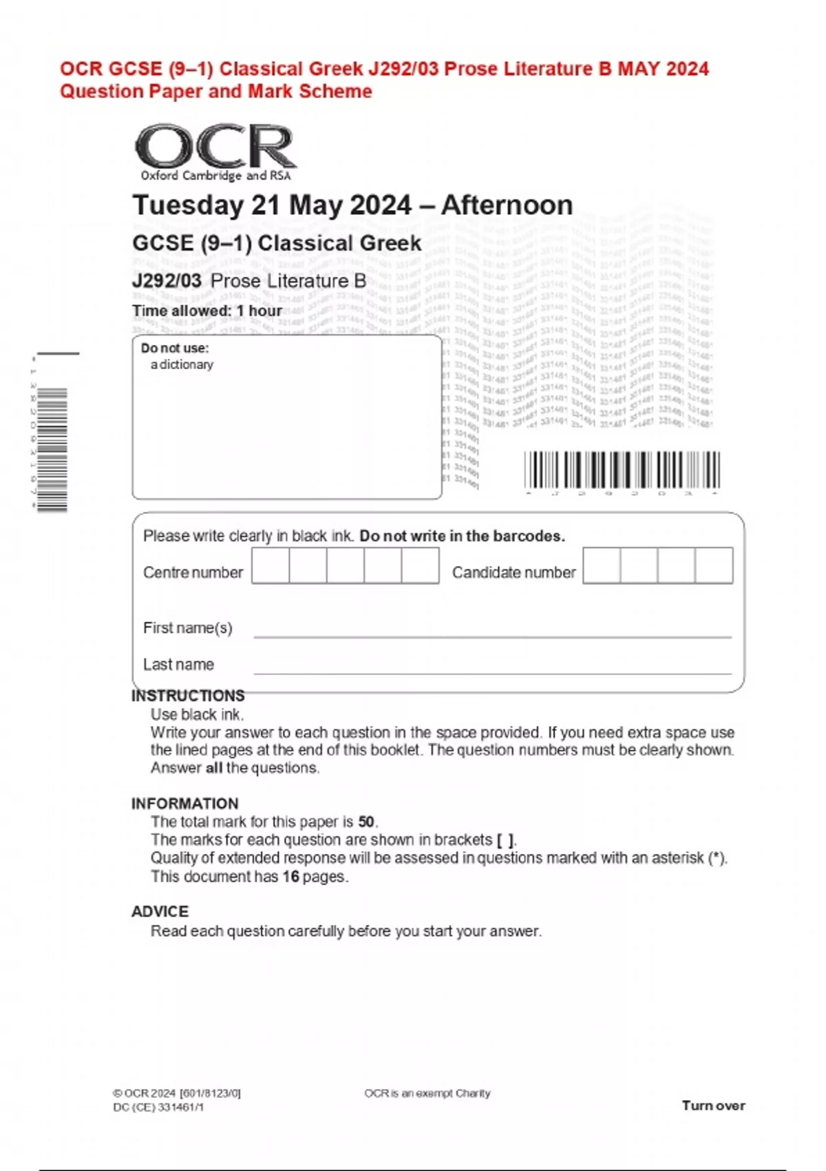 OCR GCSE (9–1) Classical Greek J292/03 Prose Literature B MAY 2024 Question Paper and Mark Scheme