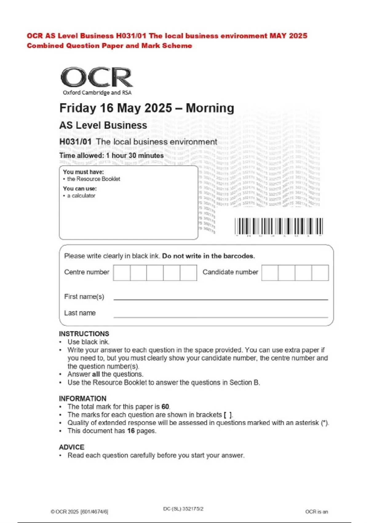 BUNDLE ::: OCR AS Level Business Question Paper with Mark Scheme / 2025