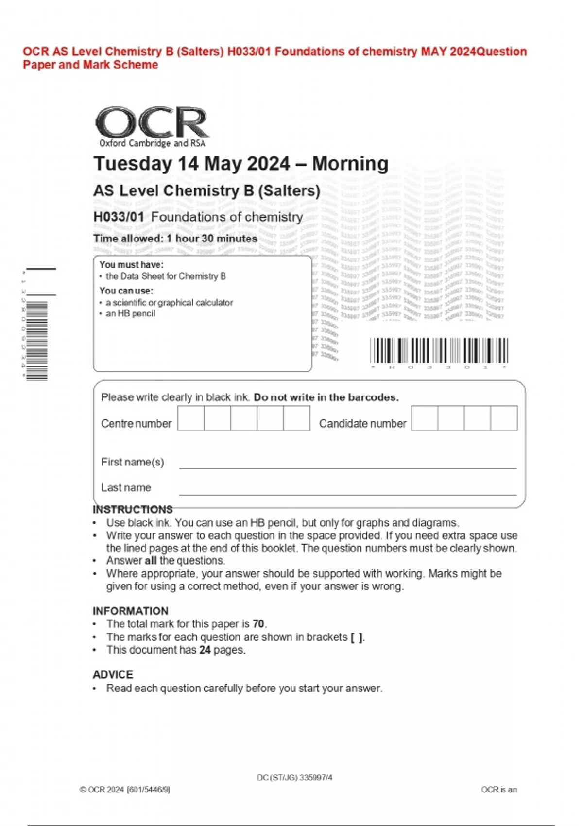 OCR AS Level Chemistry B (Salters) H033/01 Foundations of chemistry MAY 2024Question Paper and Mark Scheme