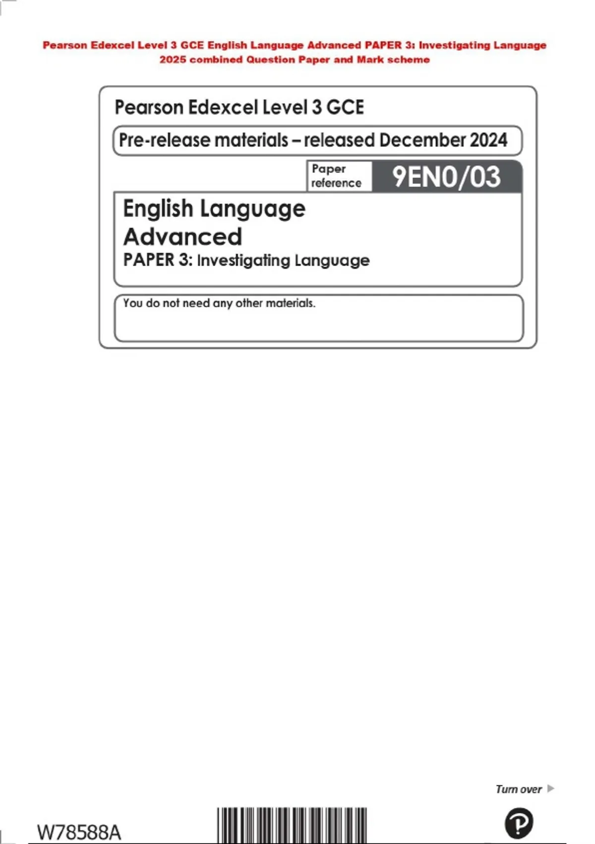 Pearson Edexcel Level 3 GCE English Language Advanced PAPER 3: Investigating Language 2025 combined Question Paper and Mark scheme