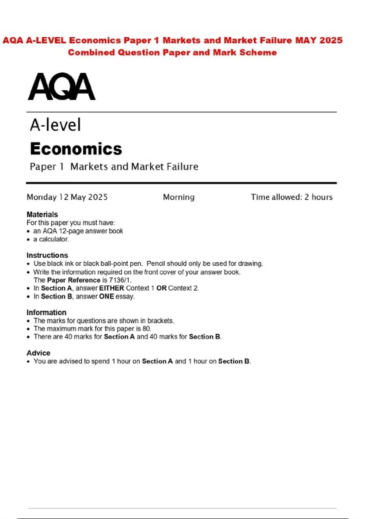 AQA A-LEVEL Economics Paper 1 Markets and Market Failure MAY 2025 Combined Question Paper and Mark Scheme