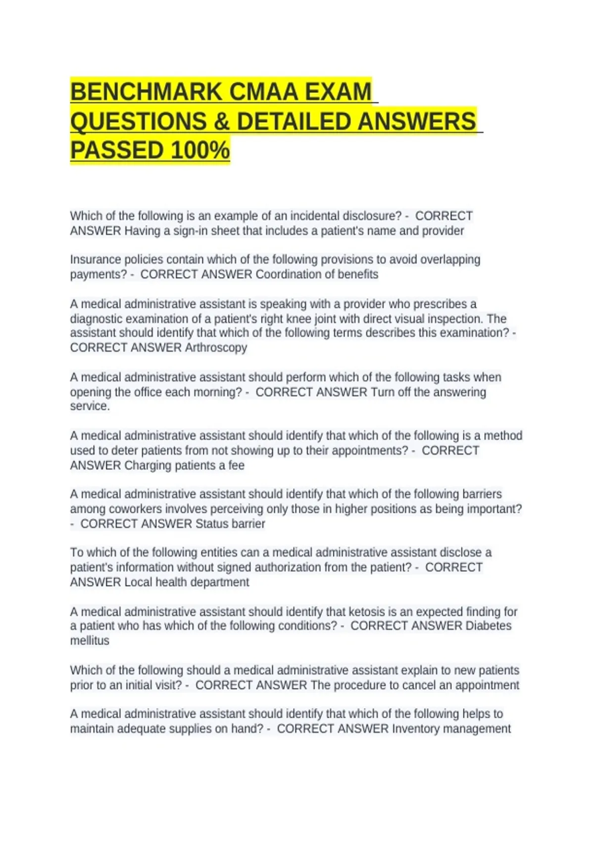COMBO CMAA TEST 1 MULTIPLE CHOICE QUESTIONS & ANSWERS PASSED RATED 100% CORRECT