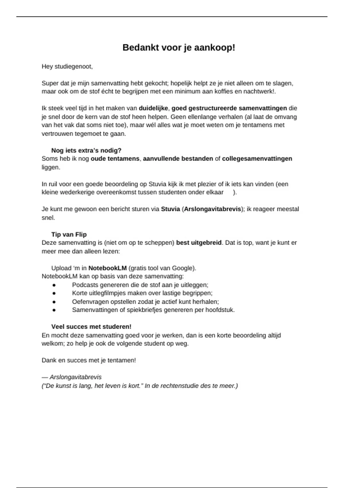 \'\'De kunst is lang, het leven is kort\'\'; in de rechtenstudie geldt dat des te meer. Daarom maak en verkoop ik samenvattingen die je snel door de kern van de stof heen helpen. Geen ellenlange verhalen, maar precies wat je moet weten om je tentamens te halen. Zo houd jij tijd over voor belangrijkere dingen dan eindeloos blokken.