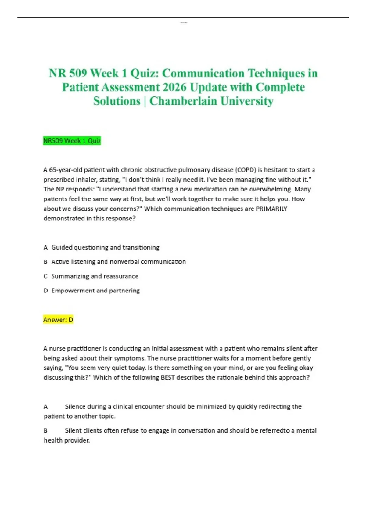 NR 509 Week 1 Quiz: Communication Techniques in Patient Assessment 2026 Update with Complete Solutions | Chamberlain University