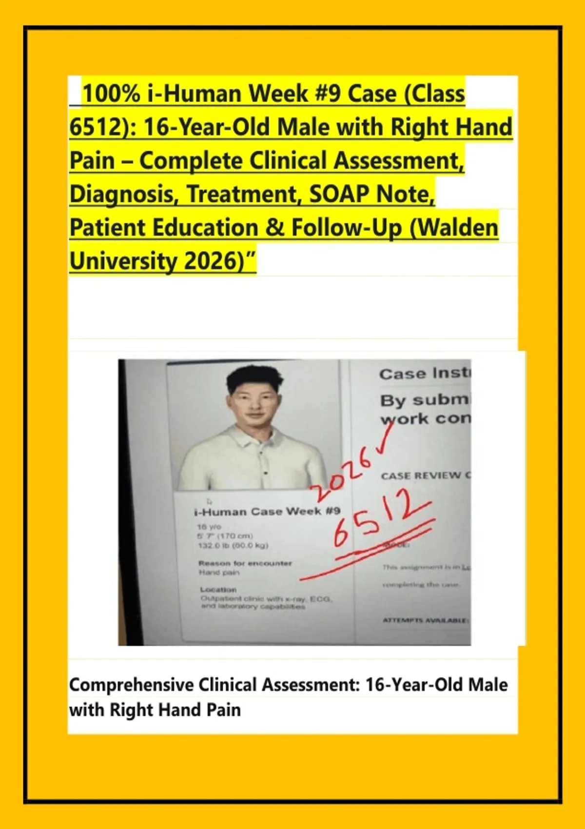 Comprehensive i-Human Week #9 Case (Class 6512): 16-Year-Old Male with Right Hand Pain – Complete Clinical Assessment, Diagnosis, Treatment, SOAP Note, Patient Education & Follow-Up (Walden University 2026)”