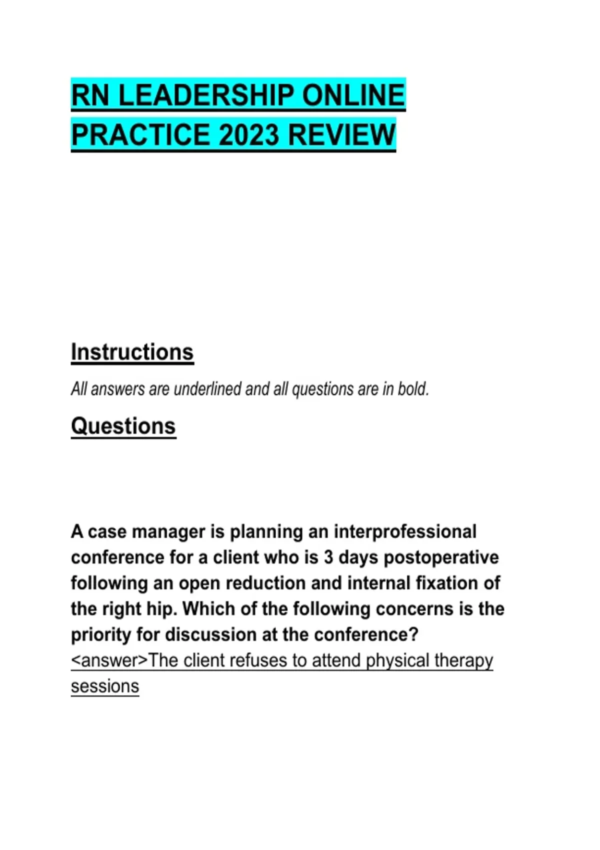 RN Leadership Online Practice A& B 2023 Review – NCLEX-Style Questions and Rationales for Registered Nursing Leadership