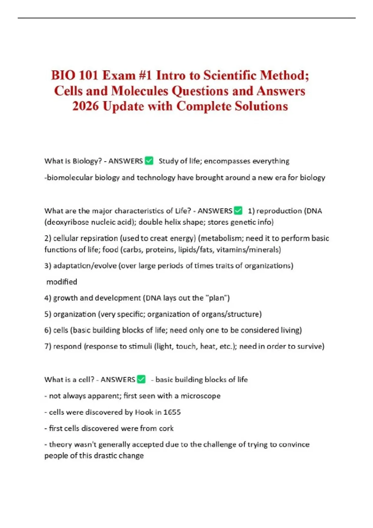 BIO 101 Exam #1 Intro to Scientific Method; Cells and Molecules Questions and Answers 2026 Update with Complete Solutions