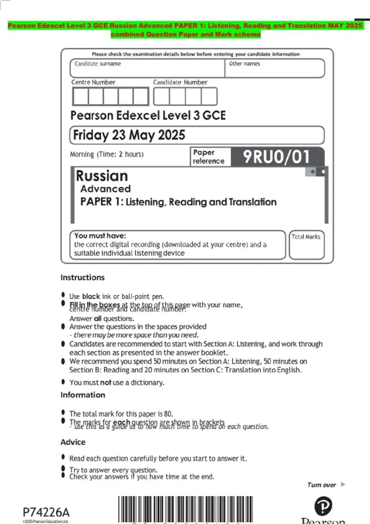 Pearson Edexcel Level 3 GCE Russian Advanced PAPER 1: Listening, Reading and Translation MAY 2025 combined Question Paper and Mark scheme