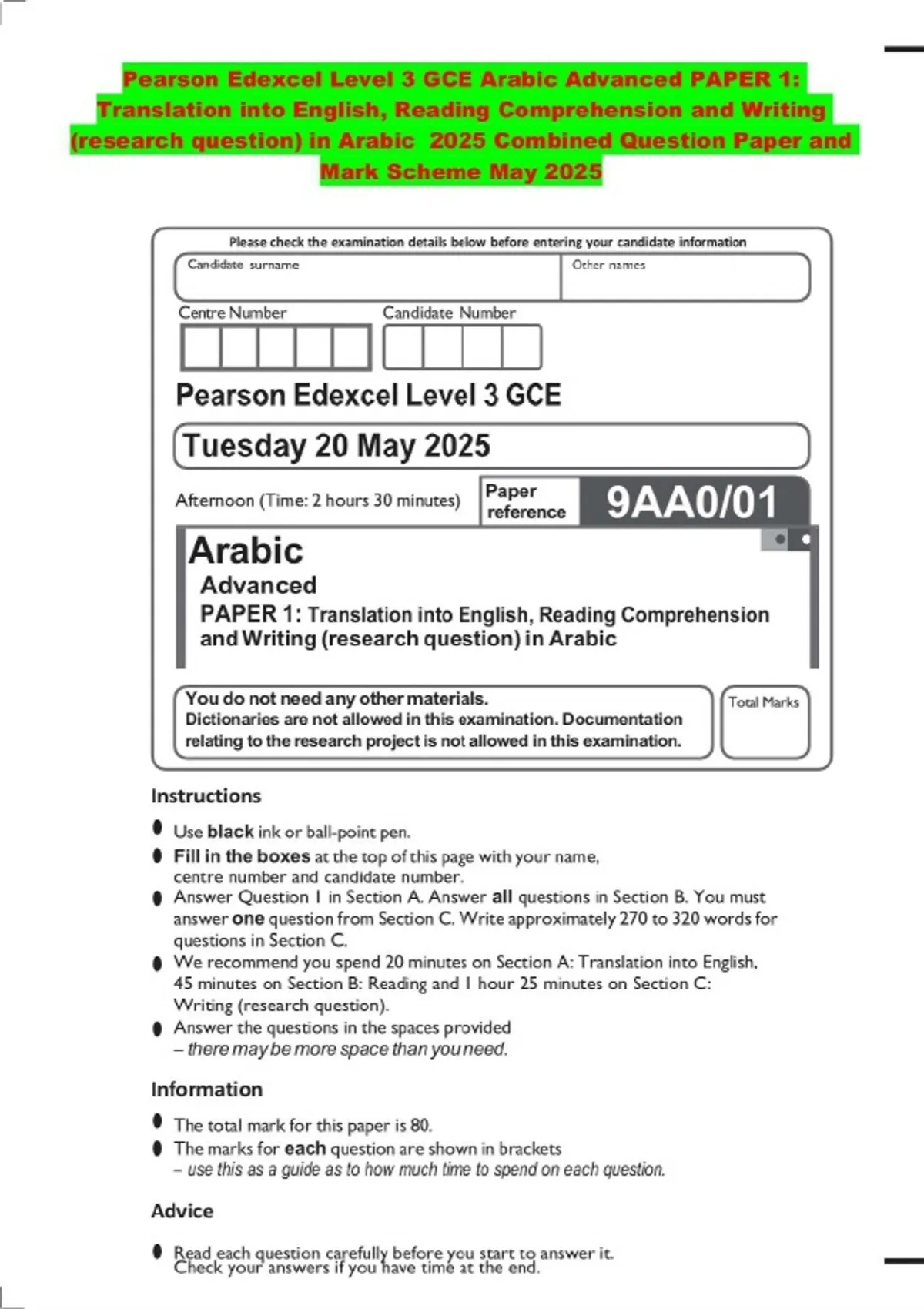 Pearson Edexcel Level 3 GCE Arabic Advanced PAPER 1: Translation into English, Reading Comprehension and Writing (research question) in Arabic 2025 Combined Question Paper and Mark Scheme May 2025