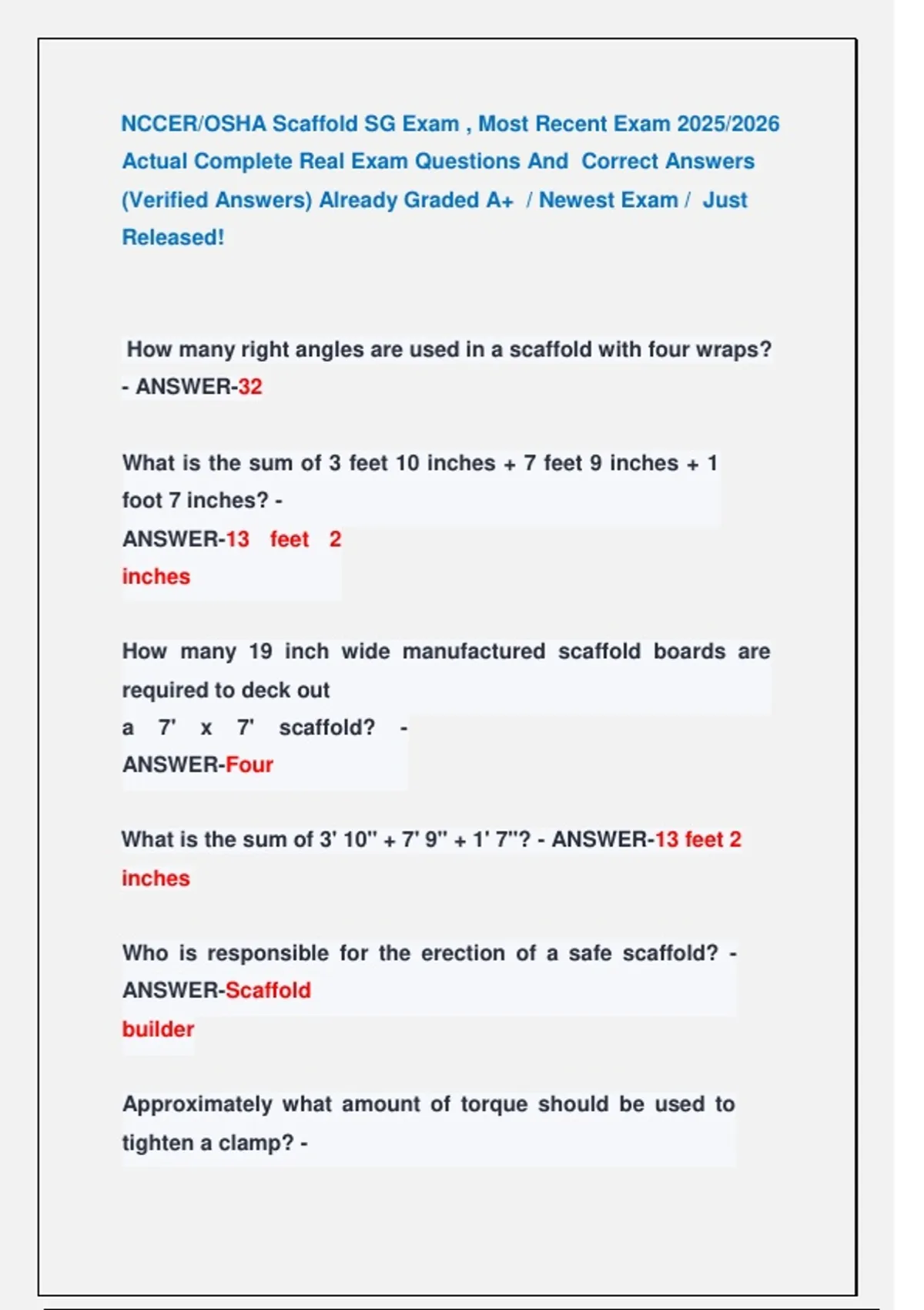 NCCER/OSHA Scaffold SG Exam , Most Recent Exam 2025/2026 Actual Complete Real Exam Questions And Correct Answers (Verified Answers) Already Graded A+ / Newest Exam / Just Released! NCCER/OSHA Scaffold SG Exam || Most Recent Exam 2026 Actual Complete Real Exam Questions And Correct Answers (Verified Answers) Already Graded A+ | Assured Success