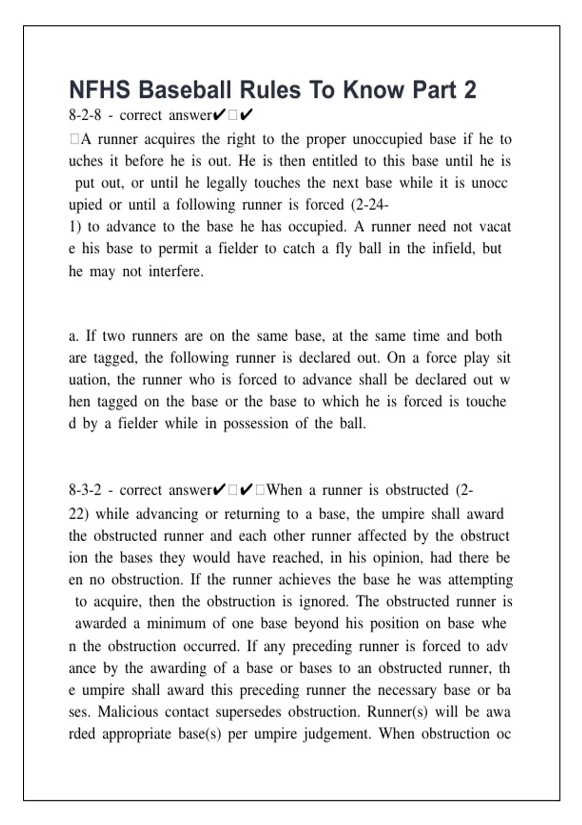 NFHS Baseball Rules To Know Part 2 questions and answers grade a+2025/2026