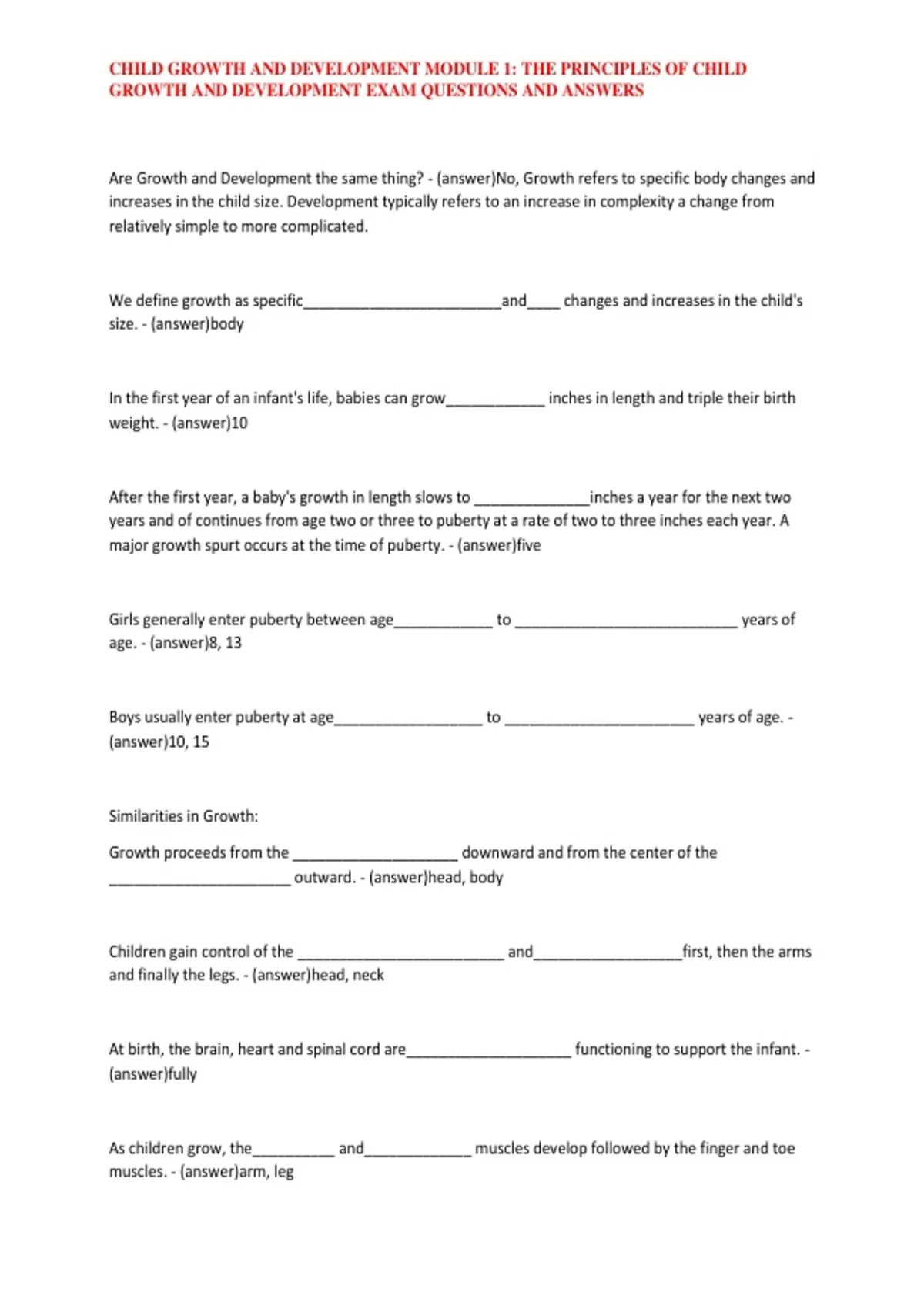 CHILD GROWTH AND DEVELOPMENT MODULE 1: THE PRINCIPLES OF CHILD GROWTH AND DEVELOPMENT EXAM QUESTIONS AND ANSWERS
