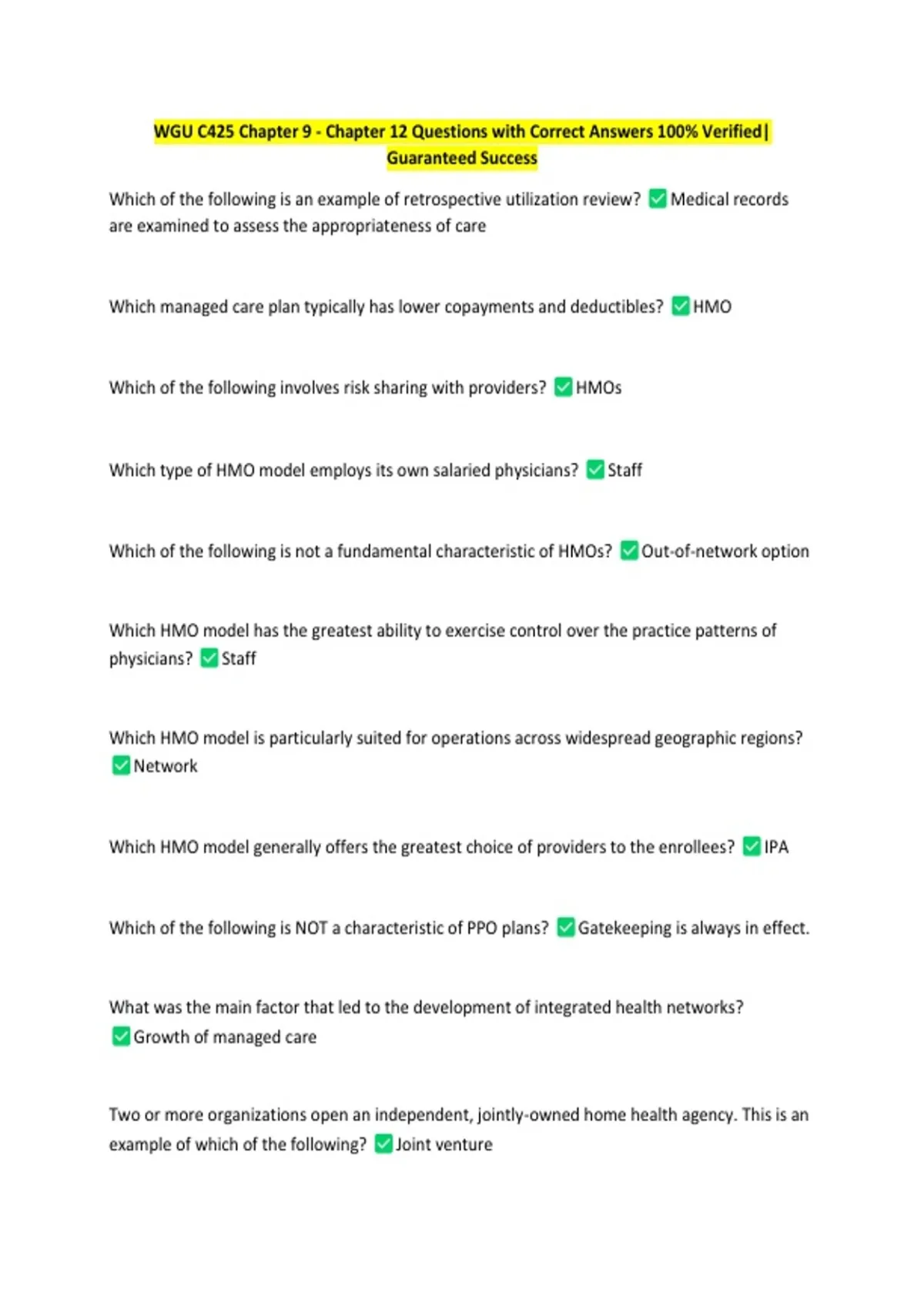 WGU C425 Chapter 1 - Chapter 5 Exam Questions with Correct Answers 100% Verified 8 Exam (elaborations) WGU C425 Chapter 6 - Chapter 8 Exam Questions with Correct Answers 100% Verified 9 Exam (elaborations) WGU C425 Study Guide Topic 3 (Healthcare Delivery Systems, Regulation, and Compliance Topic 3 of 5) Questions with Correct Answers 100% Verifi
