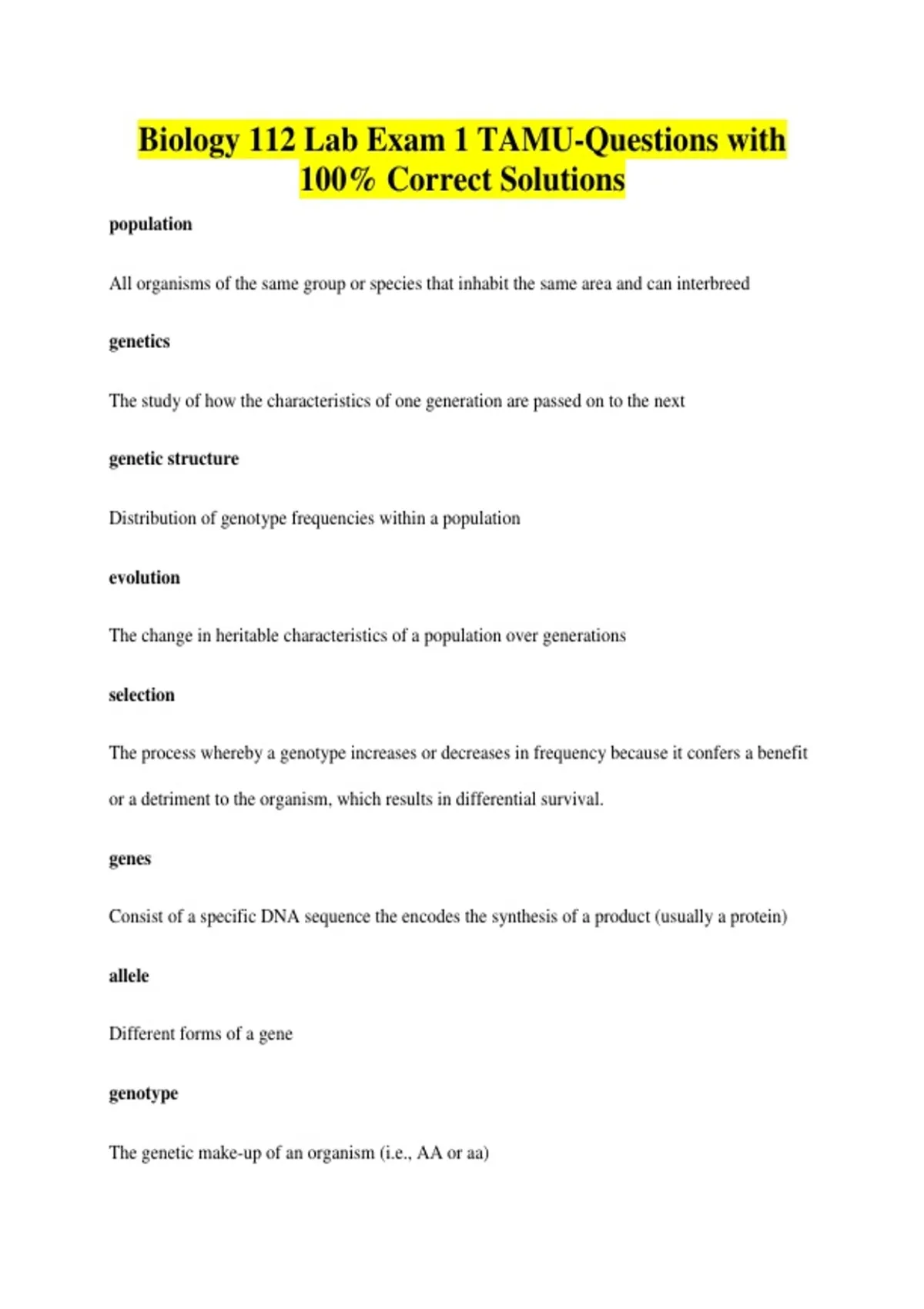 Biology 112 Lab Exam 1 TAMU-Questions with 100% Correct Solutions