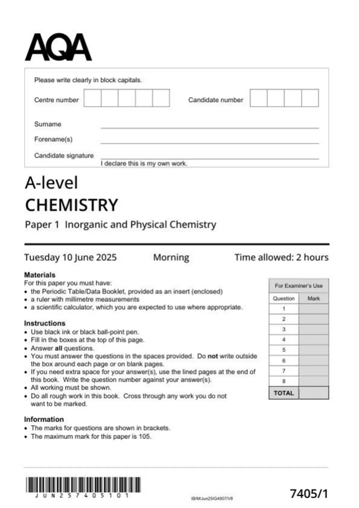 AQA A-level CHEMISTRY Paper 1 Inorganic and Physical Chemistry 2025