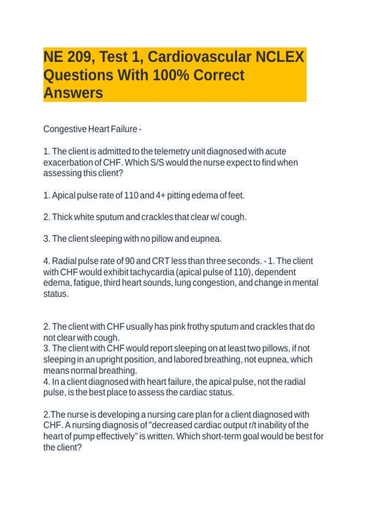 NE 209, Test 1, Cardiovascular NCLEX Questions With 100% Correct Answer|| Bundle