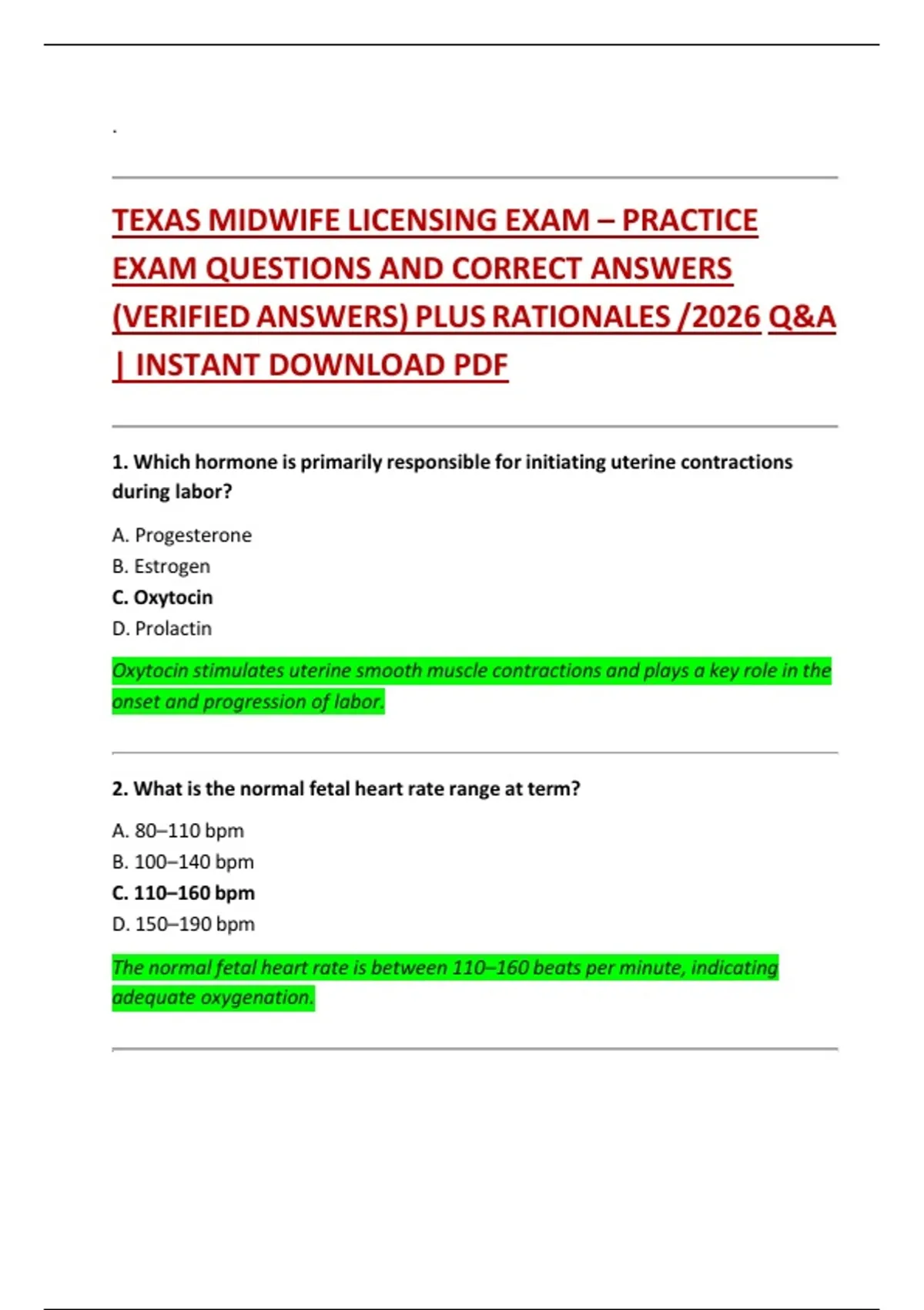 Master the Texas Midwife Licensing Exam with this comprehensive prep bundle covering TDLR regulations, labor management, fetal monitoring, neonatal resuscitation, postpartum care, and home birth contraindications. Includes focused practice questions and detailed answers to help you pass with confidence.