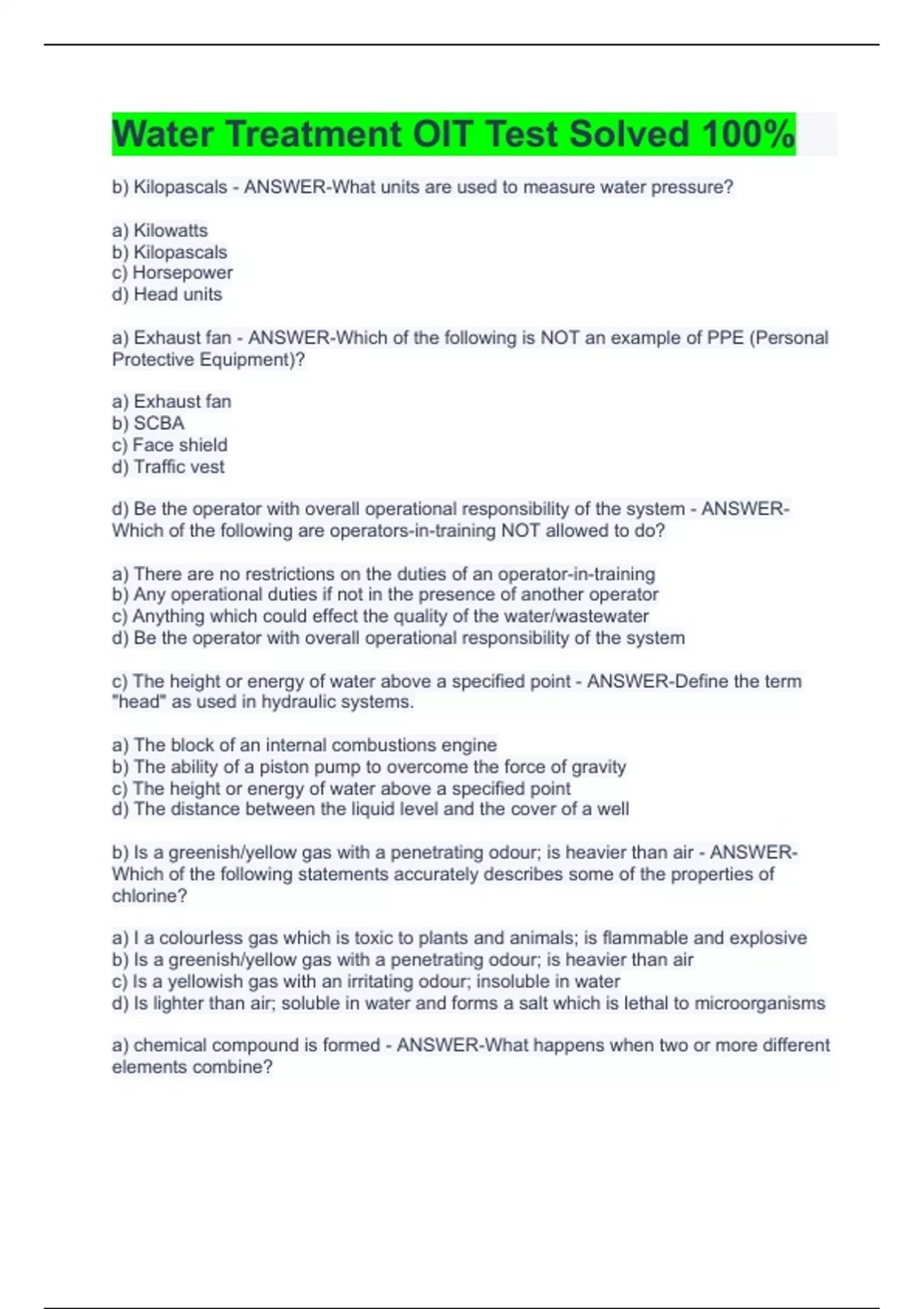 Water Treatment OIT Test Solved 100% Water Treatment Exam Preparation Grade 2 Solved 100% Correct Water Treatment Final Exam Graded A+ Water Treatment Exam 2023/24 Graded A+ Water Treatment Operator Certification Study Guide (AWWA) with Complete Solutions Water Treatment Practice Certification Exam Answered 100% Correct Water Treatment Exam 2023/2