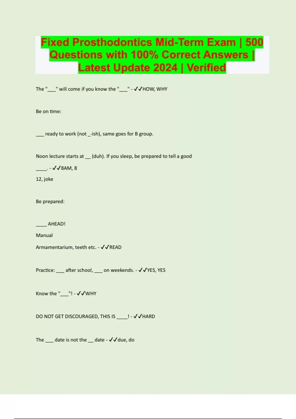 Fixed Prosthodontics Mid-Term Exam | 500 Questions with 100% Correct Answers | Latest Update 2024 | Verified | 78 Pages