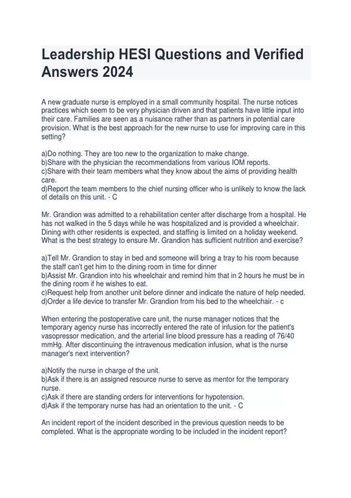 BUNDLED LEADERSHIP & MANAGEMENT HESI QUESTIONS AND ANSWERS GRADED A