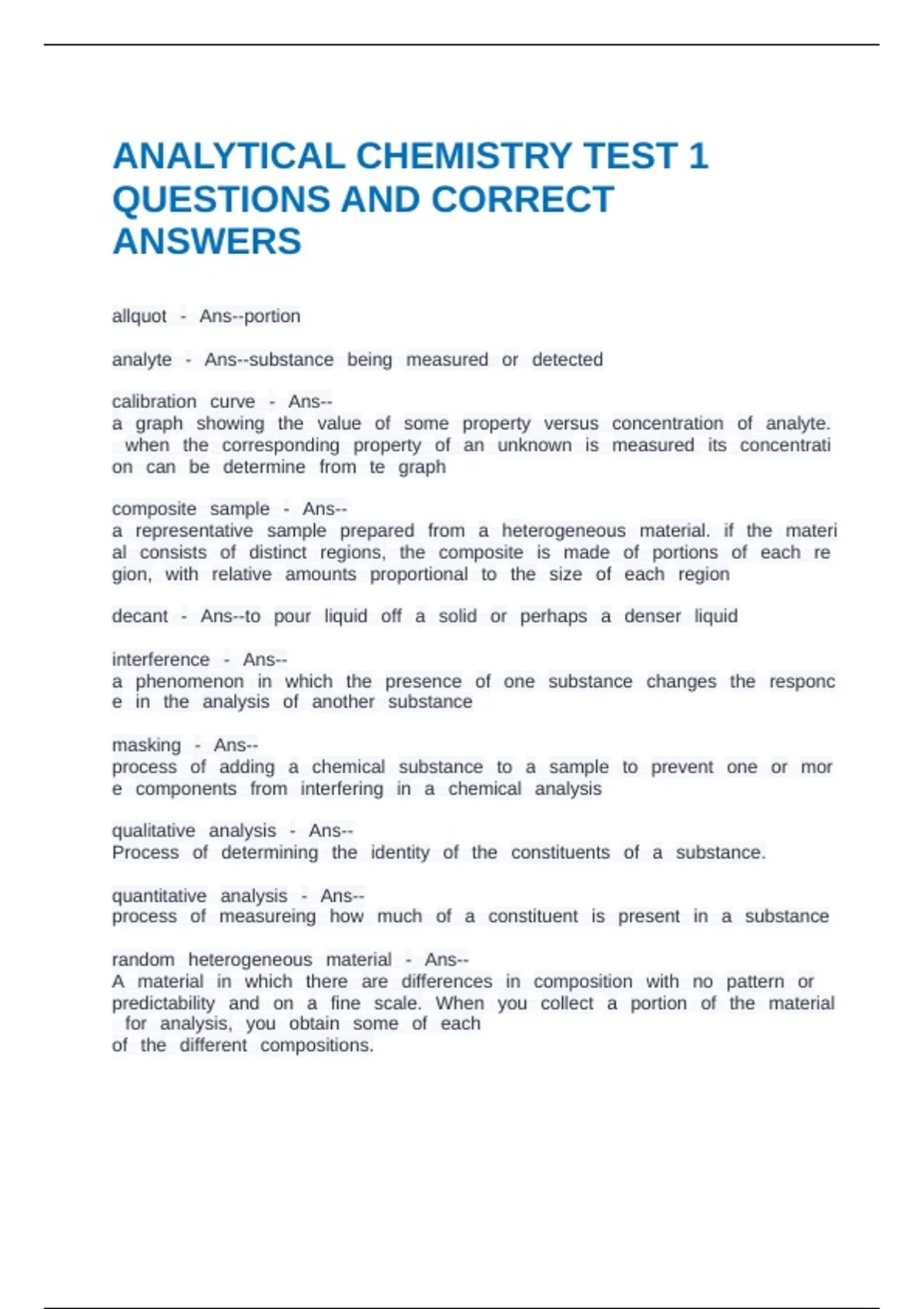 ANALYTICAL CHEMISTRY (LAB): TEST 1 QUESTIONS AND CORRECT ANSWERS