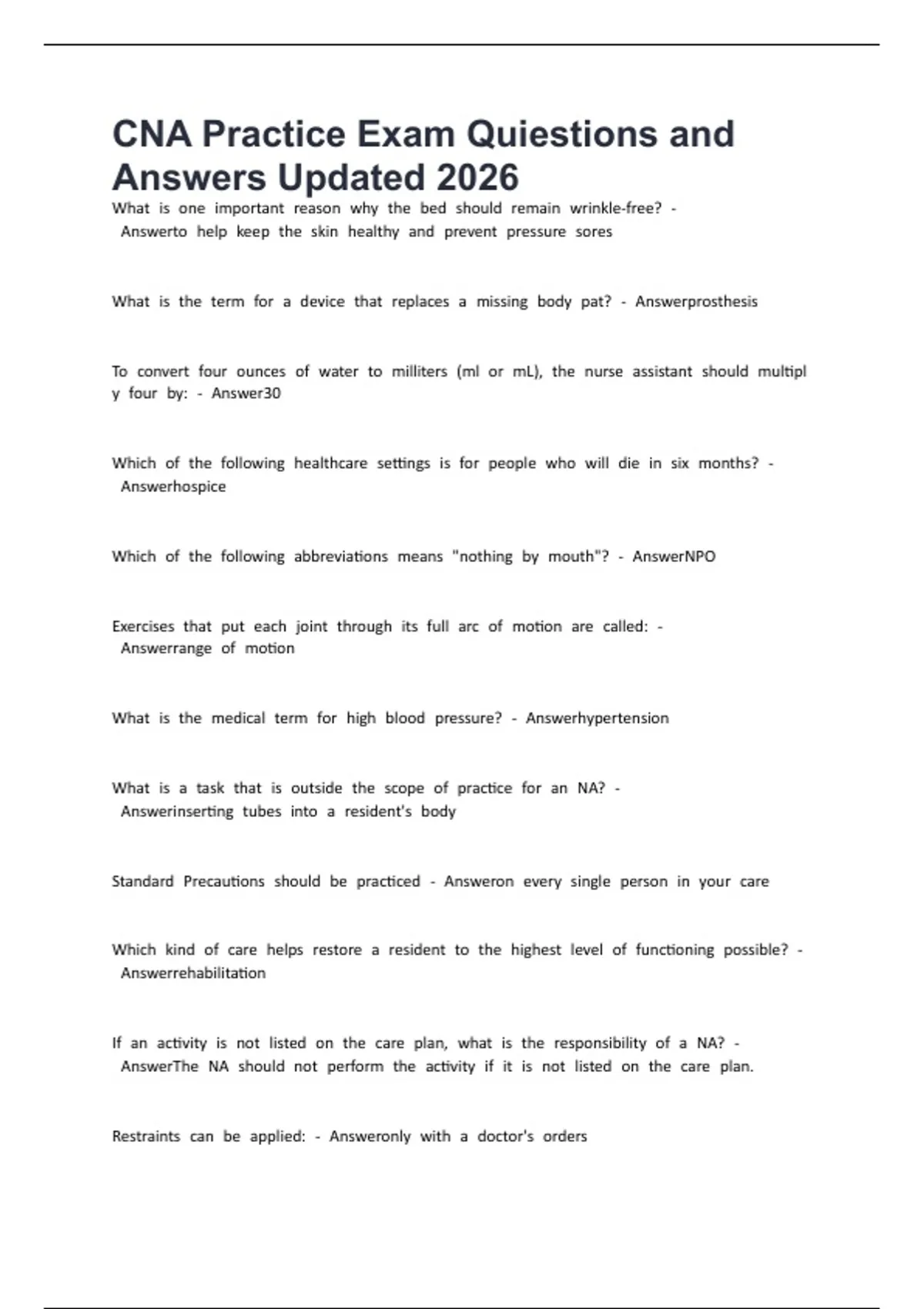 CNA FINAL EXAM Questions and Answers Updated 2026