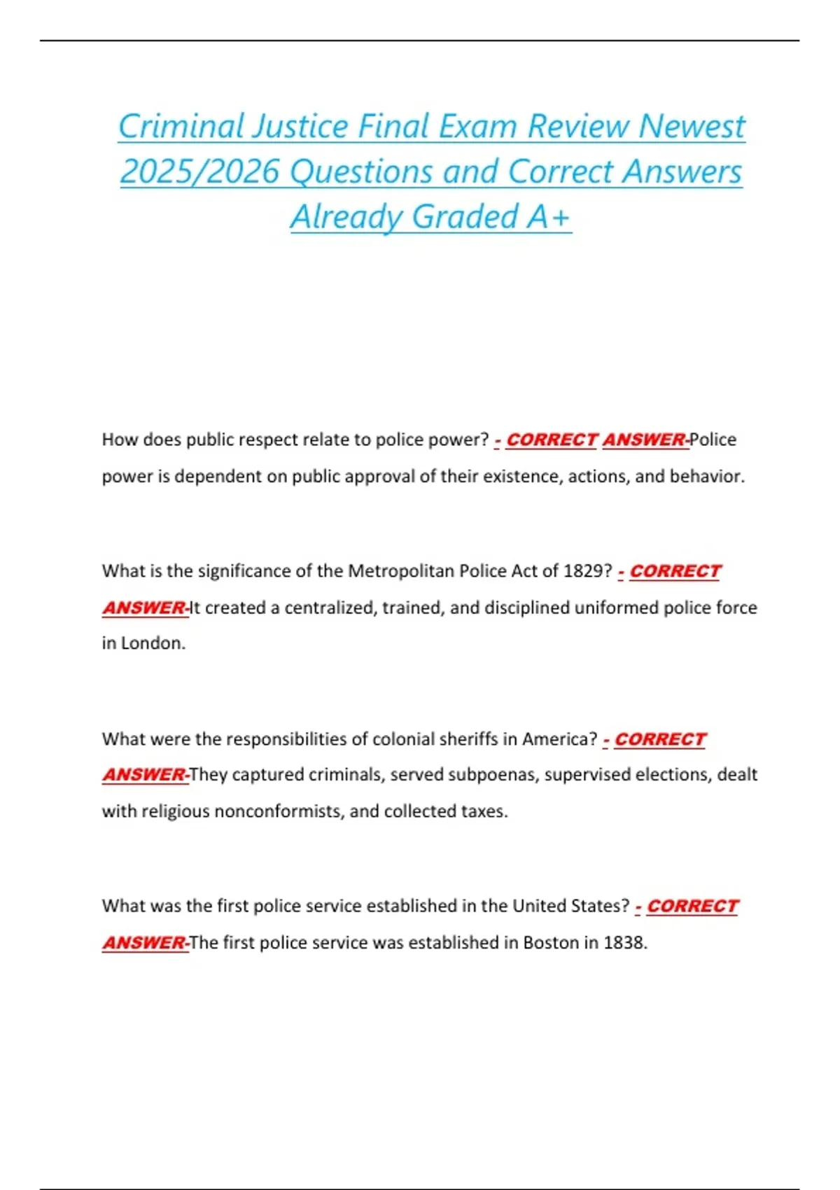 ANSWER-The first police service was established in Boston in 1838.