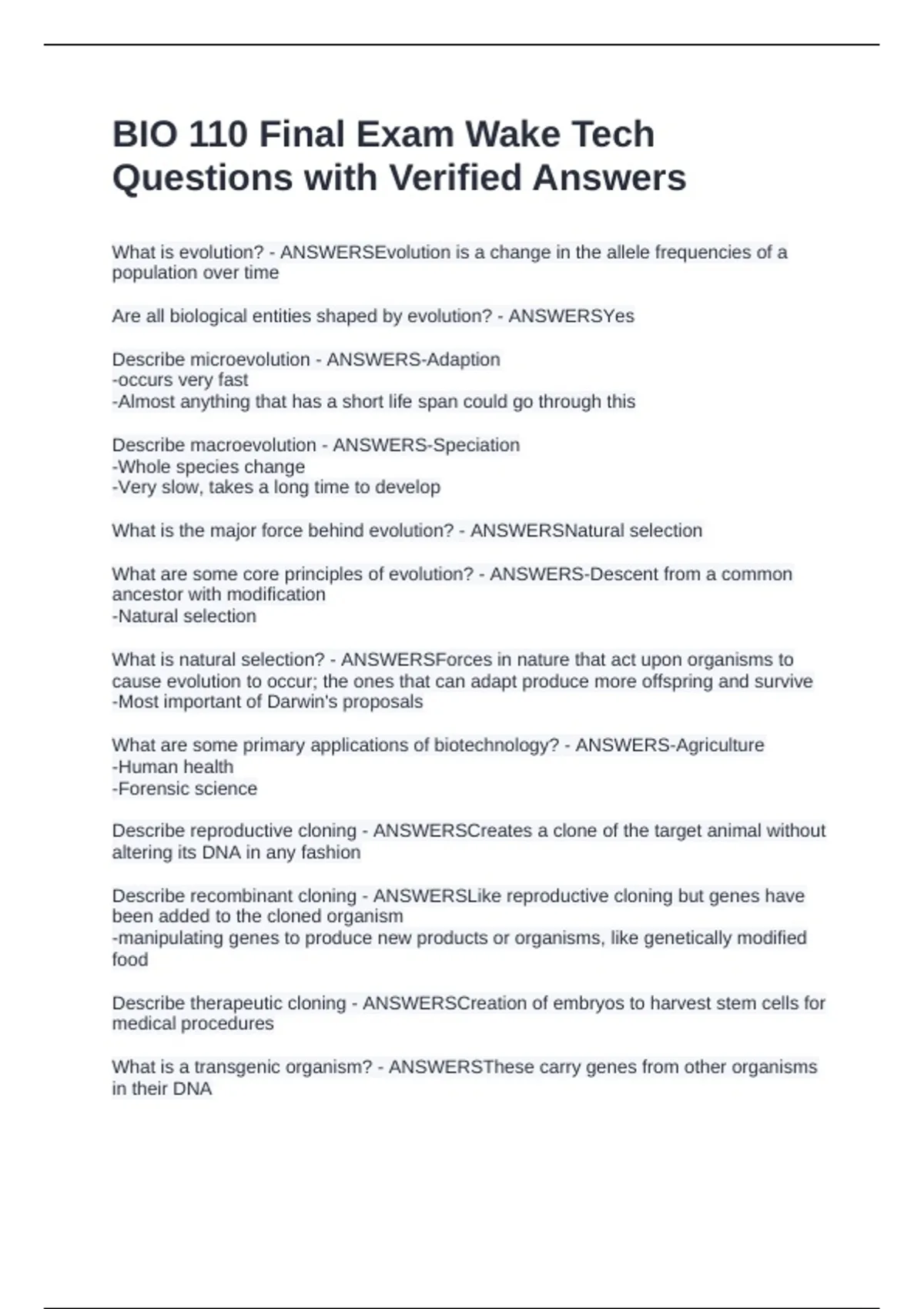 BIO 110 Final Exam Wake Tech Questions with Verified Answers