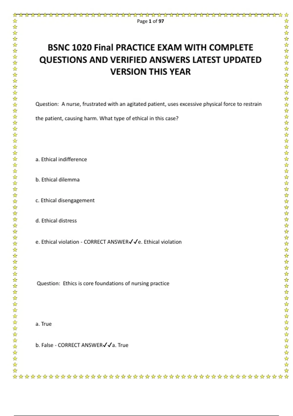 BSNC 1020 Final PRACTICE EXAM WITH COMPLETE