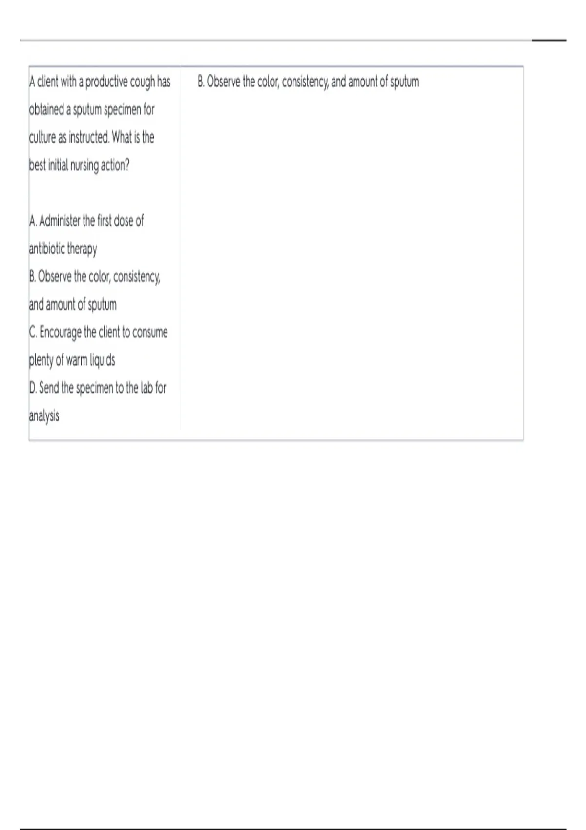 A client with a productive cough has B. Observe the color, consistency, and amount of sputum