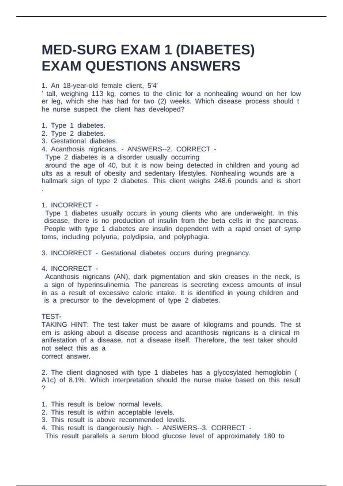 MED-SURG EXAM 1 (DIABETES) EXAM QUESTIONS ANSWERS