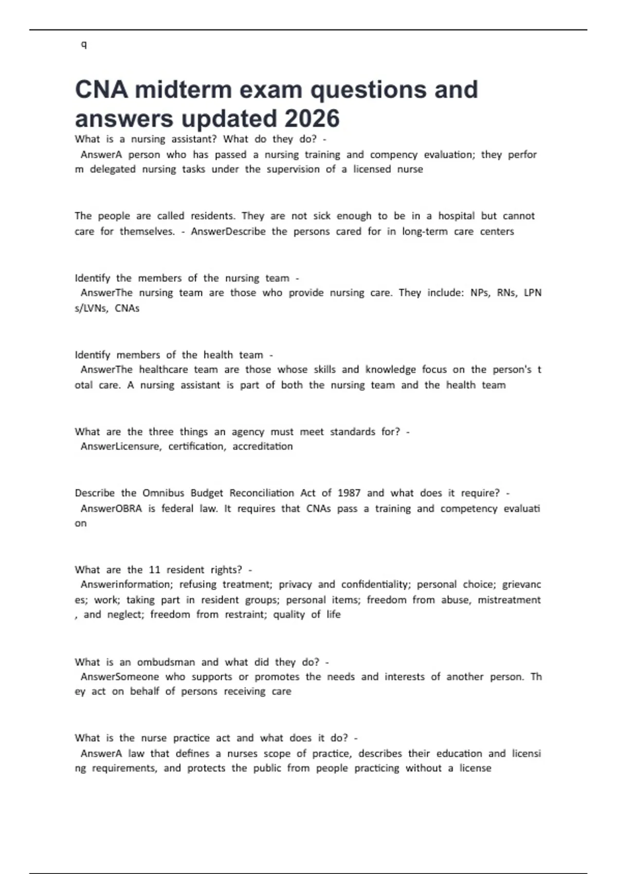 CNA midterm exam questions and