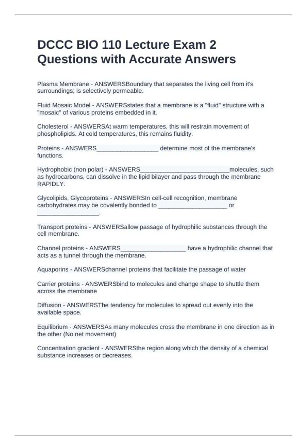 Plasma Membrane – ANSWERS Boundary that separates the living cell from it's surroundings; is selectively permeable. Fluid Mosaic Model - ANSWERSstates that a membrane is a "fluid" structure with a "mosaic" of various proteins embedded in it. Cholesterol – ANSWERS At warm temperatures, this will restrain movement of phospholipids. At cold temperatures, this remains fluidity. Proteins - ANSWERS__________________ determine most of the membrane's functions. Hydrophobic (non polar) - ANSWERS__________________________molecules, such as hydrocarbons, can dissolve in the lipid bilayer and pass through the membrane RAPIDLY. Glycolipids, Glycoproteins - ANSWERSIn cell-cell recognition, membrane carbohydrates may be covalently bonded to ____________________ or __________________. Transport proteins - ANSWERSallow passage of hydrophilic substances through the cell membrane. Channel proteins - ANSWERS___________________ have a hydrophilic channel that acts as a tunnel through the membrane. Aquaporins - ANSWERSchannel proteins that facilitate the passage of water Carrier proteins - ANSWERSbind to molecules and change shape to shuttle them across the membrane Diffusion - ANSWERSThe tendency for molecules to spread out evenly into the available space. Equilibrium - ANSWERSAs many molecules cross the membrane in one direction as in the other (No net movement) Concentration gradient - ANSWERSthe region along which the density of a chemical substance increases or decreases.