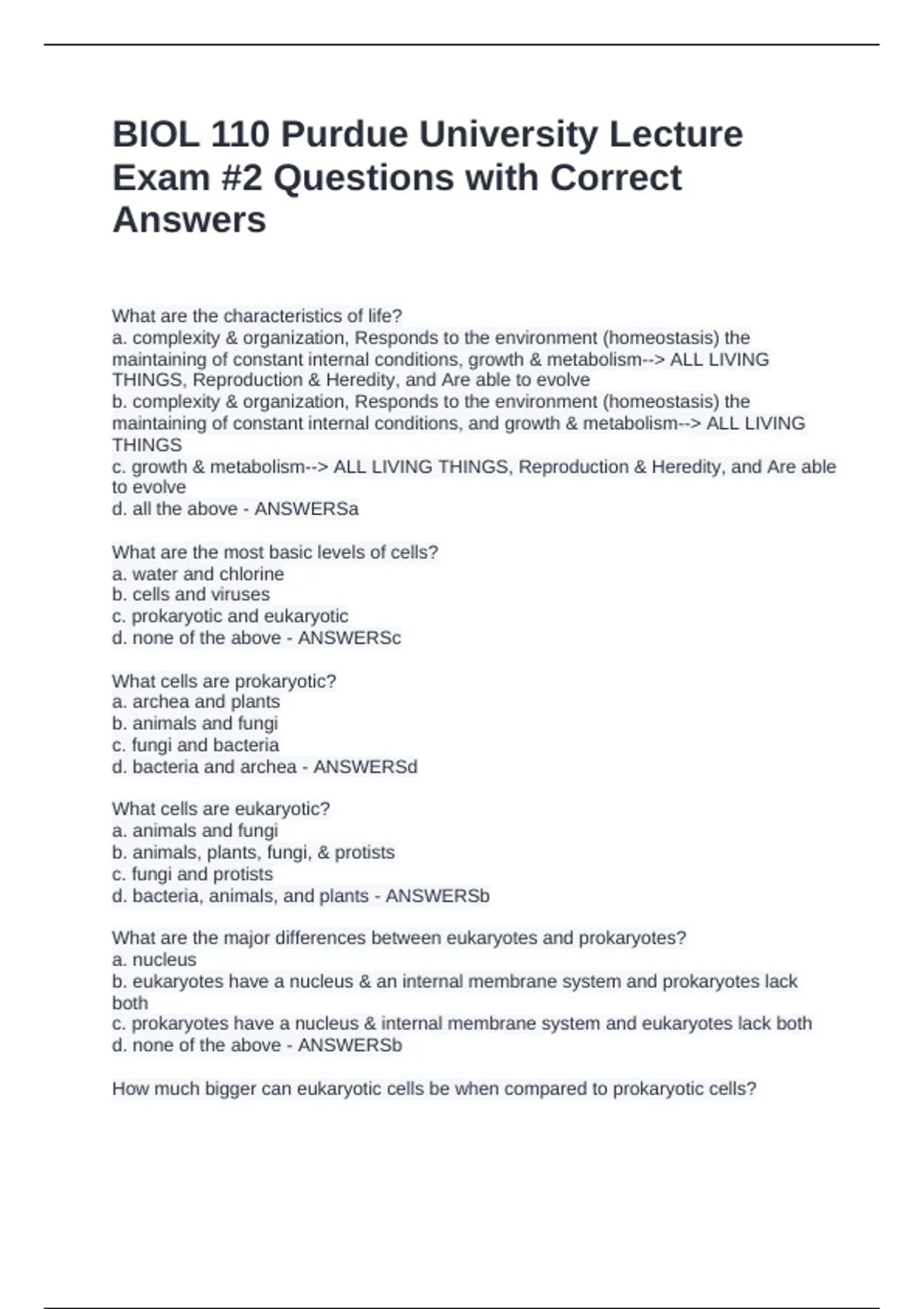 BIOL 110 Purdue University Lecture Exam #2 Questions with Correct Answers