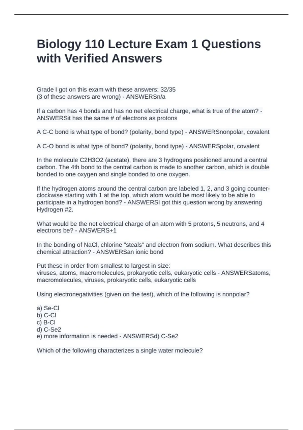 Biology 110 Lecture Exam 1 Questions with Verified Answers