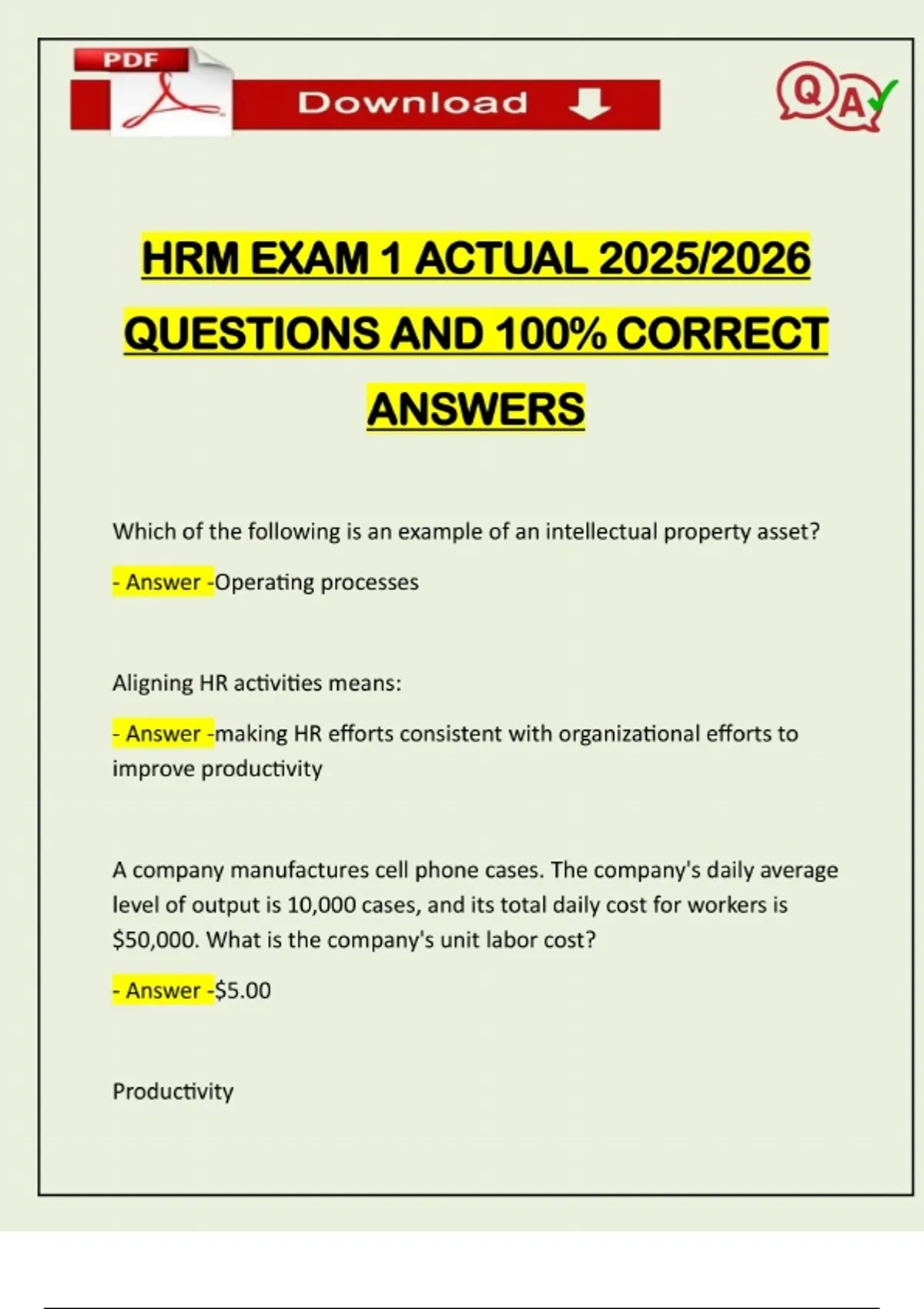 HRM EXAM 1 ACTUAL 2025/2026 QUESTIONS AND 100% CORRECT ANSWERS Which of the following is an example of an intellectual property asset? - Answer -Operating processes Aligning HR activities means: - Answer -making HR efforts consistent with organizational efforts to improve productivity A company manufactures cell phone cases. The company's daily average level of output is 10,000 cases, and its total daily cost for workers is $50,000. What is the company's unit labor cost? - Answer -$5.00