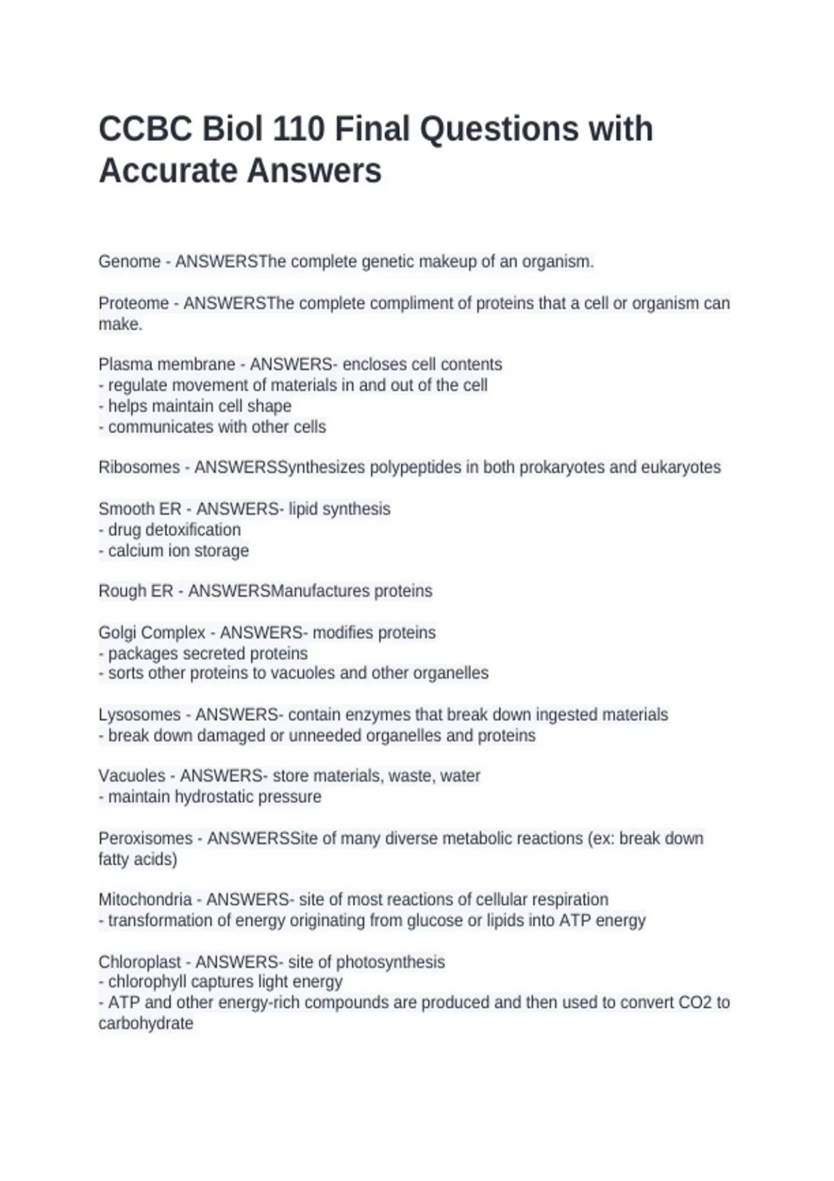 Genome - ANSWERSThe complete genetic makeup of an organism. Proteome - ANSWERSThe complete compliment of proteins that a cell or organism can make. Plasma membrane - ANSWERS- encloses cell contents - regulate movement of materials in and out of the cell - helps maintain cell shape - communicates with other cells Ribosomes - ANSWERSSynthesizes polypeptides in both prokaryotes and eukaryotes Smooth ER - ANSWERS- lipid synthesis - drug detoxification - calcium ion storage Rough ER - ANSWERSManufactures proteins Golgi Complex - ANSWERS- modifies proteins - packages secreted proteins - sorts other proteins to vacuoles and other organelles Lysosomes - ANSWERS- contain enzymes that break down ingested materials - break down damaged or unneeded organelles and proteins Vacuoles - ANSWERS- store materials, waste, water - maintain hydrostatic pressure Peroxisomes - ANSWERSSite of many diverse metabolic reactions (ex: break down fatty acids) Mitochondria - ANSWERS- site of most reactions of cellular respiration - transformation of energy originating from glucose or lipids into ATP energy Chloroplast - ANSWERS- site of photosynthesis - chlorophyll captures light energy - ATP and other energy-rich compounds are produced and then used to convert CO2 to carbohydrate
