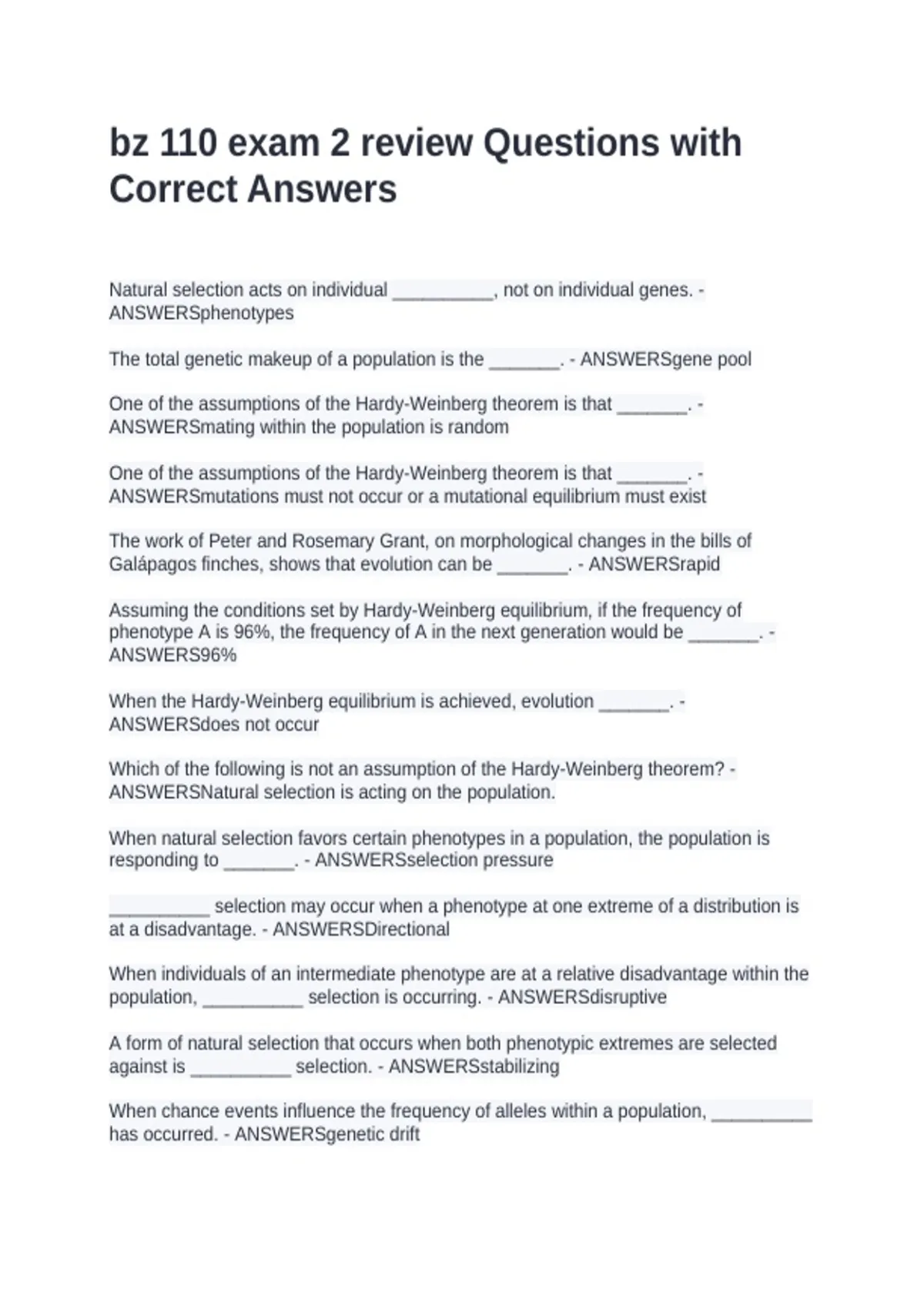 Natural selection acts on individual __________, not on individual genes. - ANSWERSphenotypes The total genetic makeup of a population is the _______. - ANSWERSgene pool One of the assumptions of the Hardy-Weinberg theorem is that _______. - ANSWERSmating within the population is random One of the assumptions of the Hardy-Weinberg theorem is that _______. - ANSWERSmutations must not occur or a mutational equilibrium must exist The work of Peter and Rosemary Grant, on morphological changes in the bills of Galápagos finches, shows that evolution can be _______. - ANSWERSrapid Assuming the conditions set by Hardy-Weinberg equilibrium, if the frequency of phenotype A is 96%, the frequency of A in the next generation would be _______. - ANSWERS96% When the Hardy-Weinberg equilibrium is achieved, evolution _______. - ANSWERSdoes not occur Which of the following is not an assumption of the Hardy-Weinberg theorem? - ANSWERSNatural selection is acting on the population. When natural selection favors certain phenotypes in a population, the population is responding to _______. - ANSWERSselection pressure __________ selection may occur when a phenotype at one extreme of a distribution is at a disadvantage. - ANSWERSDirectional When individuals of an intermediate phenotype are at a relative disadvantage within the population, __________ selection is occurring. - ANSWERSdisruptive A form of natural selection that occurs when both phenotypic extremes are selected against is __________ selection. - ANSWERSstabilizing When chance events influence the frequency of alleles within a population, __________ has occurred. - ANSWERSgenetic drift