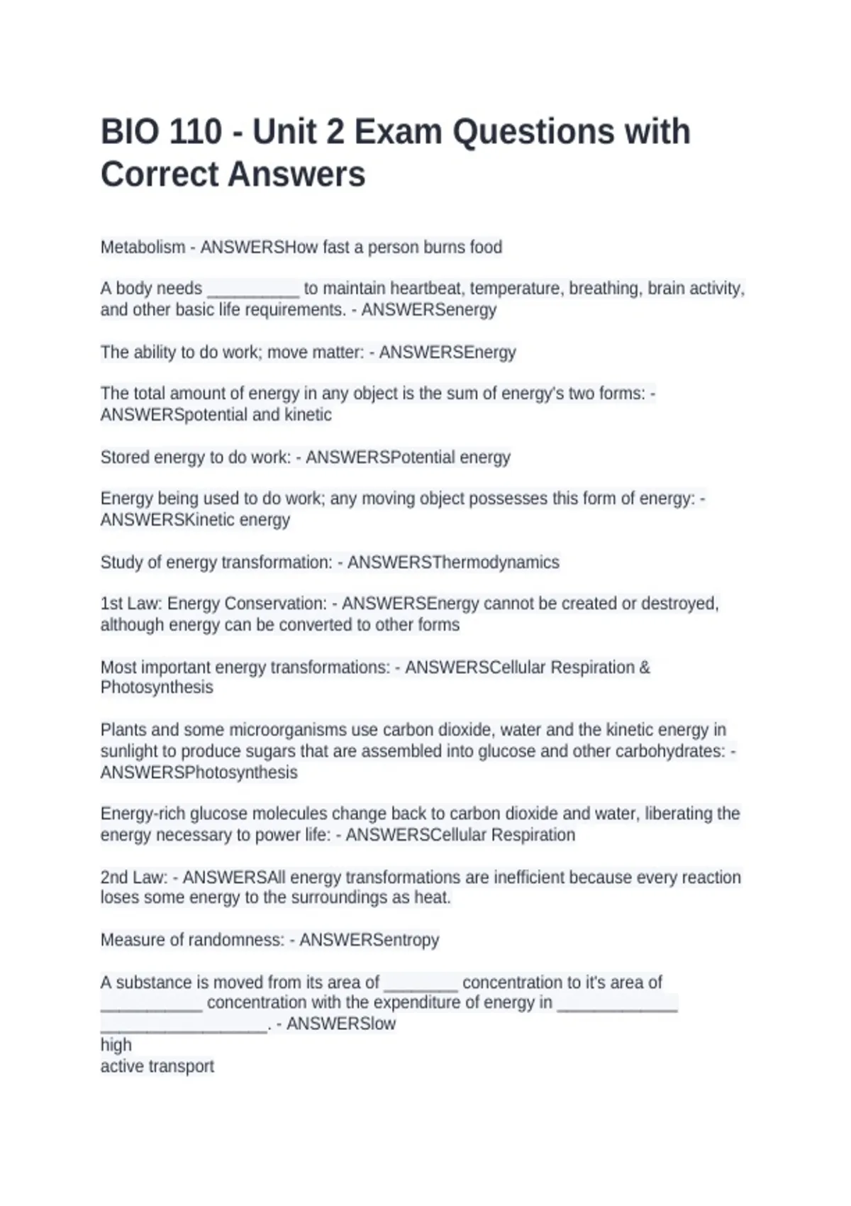 BIO 110 - Unit 2 Exam Questions with Correct Answers