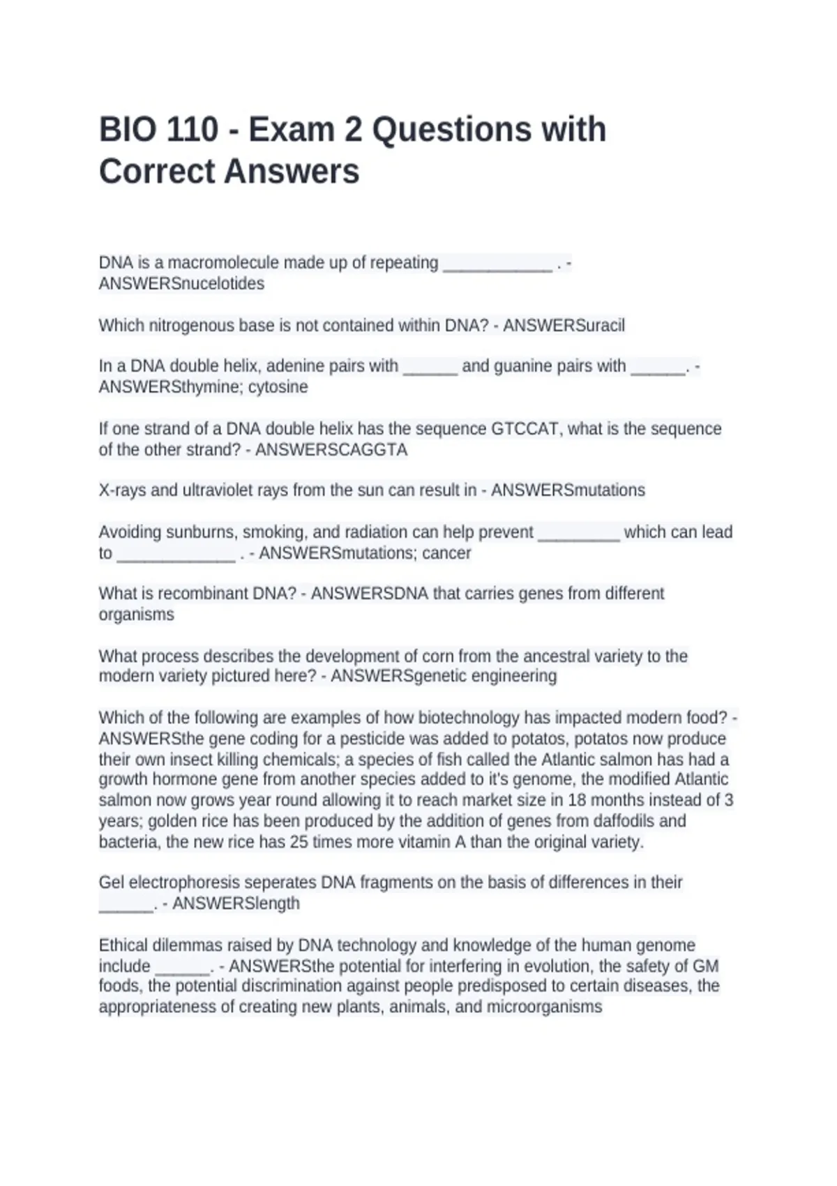 DNA is a macromolecule made up of repeating ____________ . - ANSWERSnucelotides Which nitrogenous base is not contained within DNA? - ANSWERSuracil In a DNA double helix, adenine pairs with ______ and guanine pairs with ______. - ANSWERSthymine; cytosine If one strand of a DNA double helix has the sequence GTCCAT, what is the sequence of the other strand? - ANSWERSCAGGTA X-rays and ultraviolet rays from the sun can result in - ANSWERSmutations Avoiding sunburns, smoking, and radiation can help prevent _________ which can lead to _____________ . - ANSWERSmutations; cancer What is recombinant DNA? - ANSWERSDNA that carries genes from different organisms What process describes the development of corn from the ancestral variety to the modern variety pictured here? - ANSWERSgenetic engineering Which of the following are examples of how biotechnology has impacted modern food? - ANSWERSthe gene coding for a pesticide was added to potatos, potatos now produce their own insect killing chemicals; a species of fish called the Atlantic salmon has had a growth hormone gene from another species added to it's genome, the modified Atlantic salmon now grows year round allowing it to reach market size in 18 months instead of 3 years; golden rice has been produced by the addition of genes from daffodils and bacteria, the new rice has 25 times more vitamin A than the original variety. Gel electrophoresis seperates DNA fragments on the basis of differences in their ______. - ANSWERSlength Ethical dilemmas raised by DNA technology and knowledge of the human genome include ______. - ANSWERSthe potential for interfering in evolution, the safety of GM foods, the potential discrimination against people predisposed to certain diseases, the appropriateness of creating new plants, animals, and microorganisms