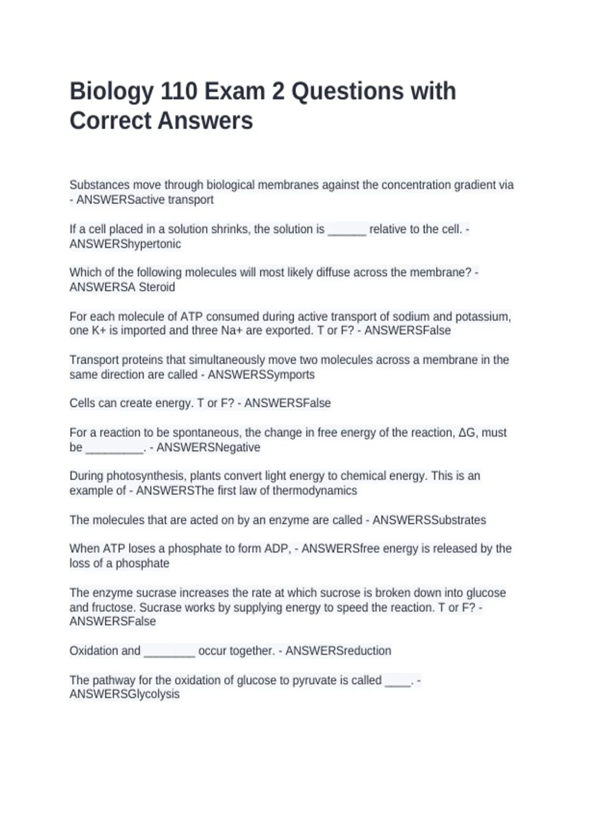 Substances move through biological membranes against the concentration gradient via - ANSWERSactive transport If a cell placed in a solution shrinks, the solution is ______ relative to the cell. - ANSWERShypertonic Which of the following molecules will most likely diffuse across the membrane? - ANSWERSA Steroid For each molecule of ATP consumed during active transport of sodium and potassium, one K+ is imported and three Na+ are exported. T or F? - ANSWERSFalse Transport proteins that simultaneously move two molecules across a membrane in the same direction are called - ANSWERSSymports Cells can create energy. T or F? - ANSWERSFalse For a reaction to be spontaneous, the change in free energy of the reaction, ΔG, must be _________. - ANSWERSNegative During photosynthesis, plants convert light energy to chemical energy. This is an example of - ANSWERSThe first law of thermodynamics The molecules that are acted on by an enzyme are called - ANSWERSSubstrates When ATP loses a phosphate to form ADP, - ANSWERSfree energy is released by the loss of a phosphate The enzyme sucrase increases the rate at which sucrose is broken down into glucose and fructose. Sucrase works by supplying energy to speed the reaction. T or F? - ANSWERSFalse Oxidation and ________ occur together. - ANSWERSreduction The pathway for the oxidation of glucose to pyruvate is called ____. - ANSWERSGlycolysis