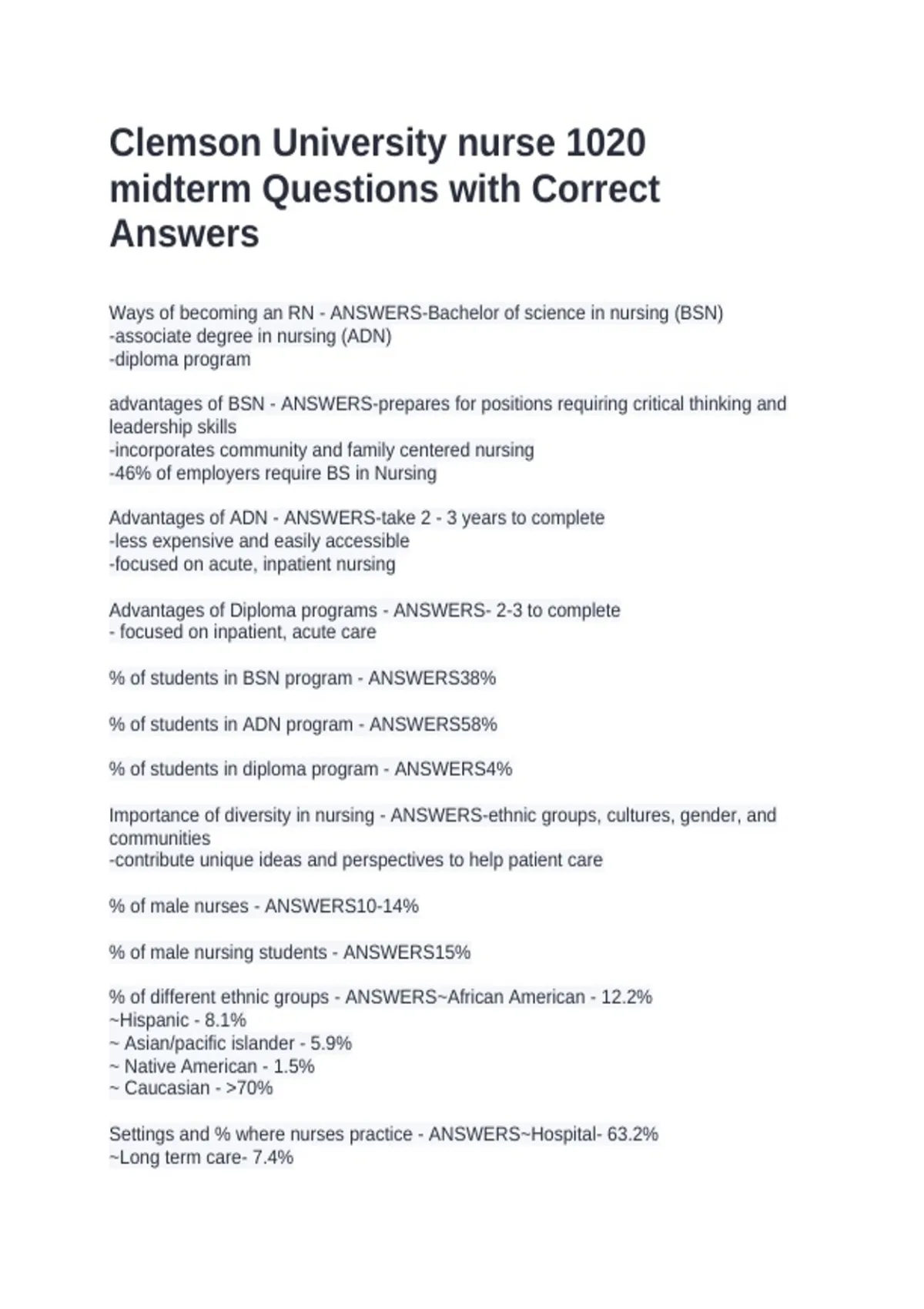Essentials of Baccalaureate Nursing education - ANSWERS- Clemson University SON