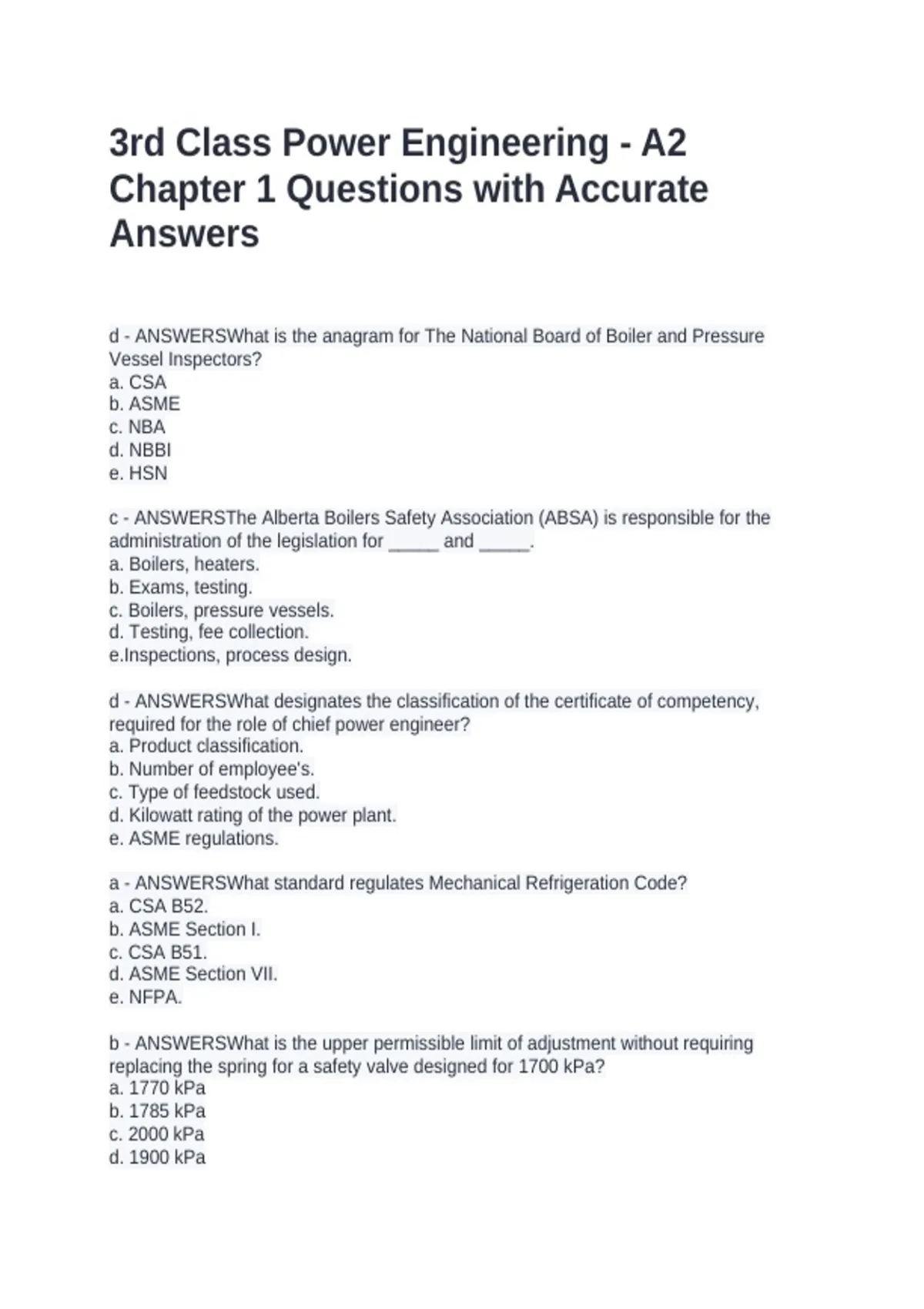 d – ANSWERS What is the anagram for The National Board of Boiler and Pressure Vessel Inspectors? a. CSA b. ASME c. NBA d. NBBI e. HSN c – ANSWERS The Alberta Boilers Safety Association (ABSA) is responsible for the administration of the legislation for _____ and _____. a. Boilers, heaters. b. Exams, testing. c. Boilers, pressure vessels. d. Testing, fee collection. e.Inspections, process design. d - ANSWERSWhat designates the classification of the certificate of competency, required for the role of chief power engineer? a. Product classification. b. Number of employee's. c. Type of feedstock used. d. Kilowatt rating of the power plant. e. ASME regulations. a - ANSWERSWhat standard regulates Mechanical Refrigeration Code? a. CSA B52. b. ASME Section I. c. CSA B51. d. ASME Section VII. e. NFPA. b - ANSWERSWhat is the upper permissible limit of adjustment without requiring replacing the spring for a safety valve designed for 1700 kPa? a. 1770 kPa b. 1785 kPa c. 2000 kPa d. 1900 kPa e. 1751 kPa