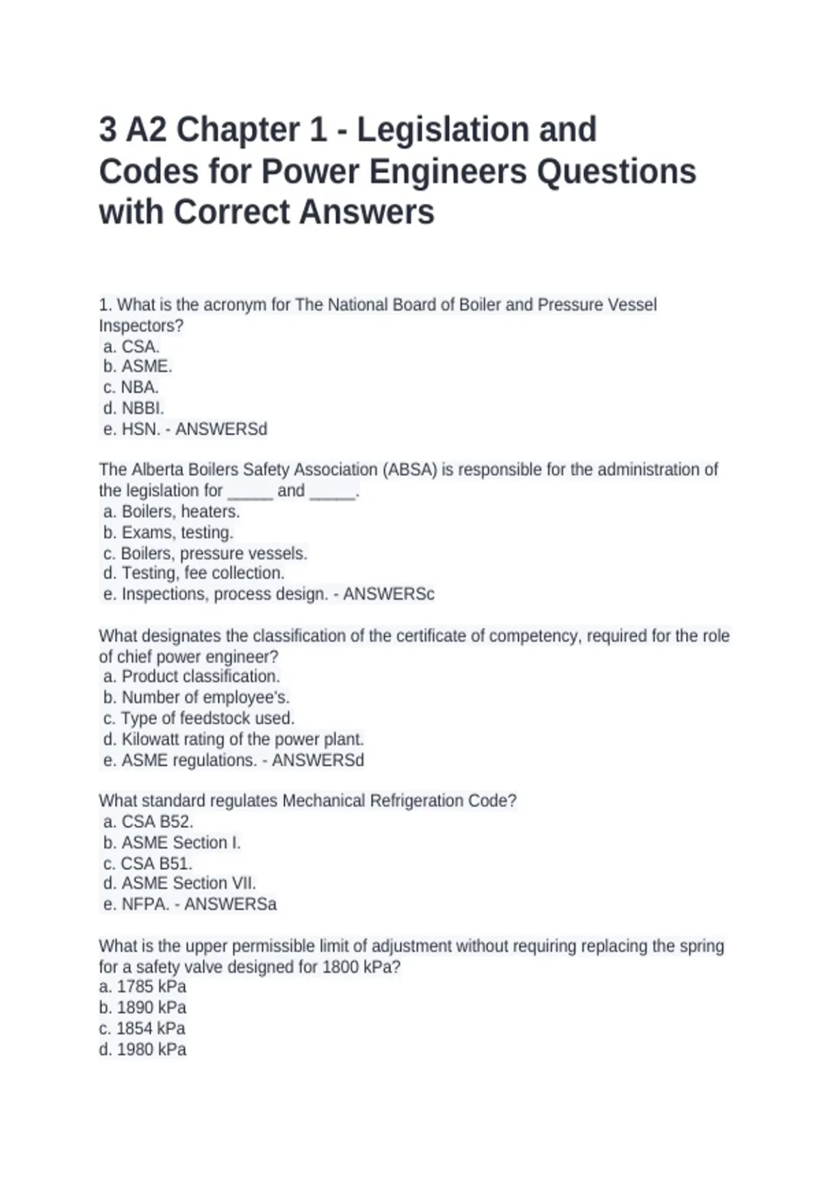 1. What is the acronym for The National Board of Boiler and Pressure Vessel Inspectors? a. CSA. b. ASME. c. NBA. d. NBBI. e. HSN. - ANSWERSd The Alberta Boilers Safety Association (ABSA) is responsible for the administration of the legislation for _____ and _____. a. Boilers, heaters. b. Exams, testing. c. Boilers, pressure vessels. d. Testing, fee collection. e. Inspections, process design. - ANSWERSc What designates the classification of the certificate of competency, required for the role of chief power engineer? a. Product classification. b. Number of employee's. c. Type of feedstock used. d. Kilowatt rating of the power plant. e. ASME regulations. - ANSWERSd What standard regulates Mechanical Refrigeration Code? a. CSA B52. b. ASME Section I. c. CSA B51. d. ASME Section VII. e. NFPA. - ANSWERSa What is the upper permissible limit of adjustment without requiring replacing the spring for a safety valve designed for 1800 kPa? a. 1785 kPa b. 1890 kPa c. 1854 kPa d. 1980 kPa e. 1800 kPa. - ANSWERSb