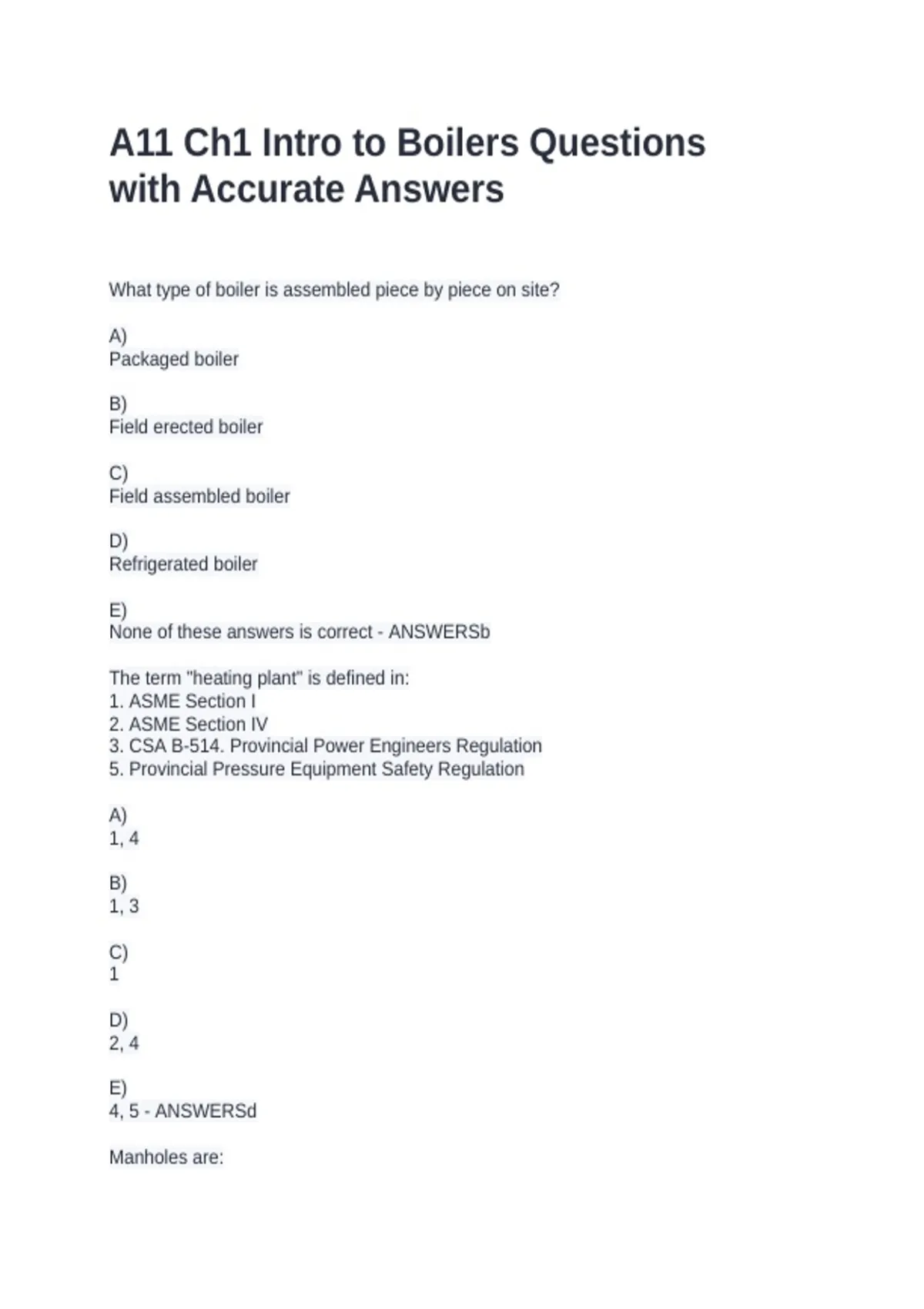 What type of boiler is assembled piece by piece on site? A) Packaged boiler B) Field erected boiler C) Field assembled boiler D) Refrigerated boiler E) None of these answers is correct - ANSWERSb The term "heating plant" is defined in: 1. ASME Section I 2. ASME Section IV 3. CSA B-514. Provincial Power Engineers Regulation 5. Provincial Pressure Equipment Safety Regulation A) 1, 4 B) 1, 3 C) 1 D) 2, 4 E) 4, 5 - ANSWERSd Manholes are: A) Provided for inspection purposes B) Always oval in shape C) Always circular in shape D) Installed on fossil fired boilers only E) Installed on all boilers - ANSWERSa