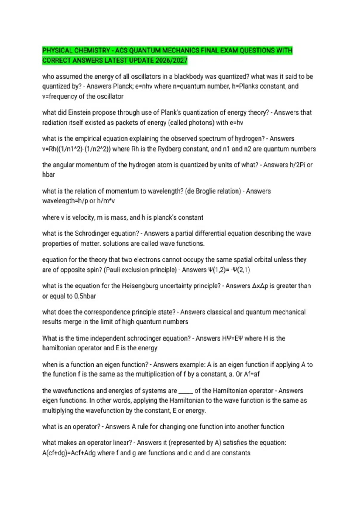 PHYSICAL CHEMISTRY - ACS QUANTUM MECHANICS FINAL EXAM QUESTIONS WITH CORRECT ANSWERS LATEST UPDATE 2026/2027 who assumed the energy of all oscillators in a blackbody was quantized? what was it said to be quantized by? - Answers Planck; e=nhv where n=quantum number, h=Planks constant, and v=frequency of the oscillator what did Einstein propose through use of Plank's quantization of energy theory? - Answers that radiation itself existed as packets of energy (called photons) with e=hv what is the empirical equation explaining the observed spectrum of hydrogen? - Answers v=Rh((1/n1^2)-(1/n2^2)) where Rh is the Rydberg constant, and n1 and n2 are quantum numbers the angular momentum of the hydrogen atom is quantized by units of what? - Answers h/2Pi or hbar what is the relation of momentum to wavelength? (de Broglie relation) - Answers wavelength=h/p or h/m*v where v is velocity, m is mass, and h is planck's constant what is the Schrodinger equation? - Answers a partial differential equation describing the wave properties of matter. solutions are called wave functions. equation for the theory that two electrons cannot occupy the same spatial orbital unless they are of opposite spin? (Pauli exclusion principle) - Answers Ψ(1,2)= -Ψ(2,1) what is the equation for the Heisengburg uncertainty principle? - Answers ΔxΔp is greater than or equal to 0.5hbar what does the correspondence principle state? - Answers classical and quantum mechanical results merge in the limit of high quantum numbers What is the time independent schrodinger equation? - Answers HΨ=EΨ where H is the hamiltonian operator and E is the energy when is a function an eigen function? - Answers example: A is an eigen function if applying A to the function f is the same as the multiplication of f by a constant, a. Or Af=af the wavefunctions and energies of systems are _____ of the Hamiltonian operator - Answers eigen functions. In other words, applying the Hamiltonian to the wave function is the same as multiplying the wavefunction by the constant, E or energy. what is an operator? - Answers A rule for changing one function into another function what makes an operator linear? - Answers it (represented by A) satisfies the equation: A(cf+dg)=Acf+Adg where f and g are functions and c and d are constants what makes an operator Hermitian? - Answers it (represented by A) satisfies the equation: INTEGRAL(fAg dT) = INTEGRAL(gAf dT) what is the Born-Oppenheimer approximation? - Answers because the electrons in molecules move much more quickly than the nucleus, we assume the nucleus is fixed what is the Fanck-Condon principle? - Answers because nuclei are much more massive than electrons, en electronic transition takes place in the presence of a fixed nucleus why isn't every solution to the Schrondinger equation acceptable? - Answers because of boundary conditions for each given problem. Also, the wave function must be continuous, continually differentiablex, single-valued (i.e. can't have 2 possible Y values for one X value), finite-valued (i.e. can't go to infinity), and able to be normalized over the appropriate range when a set is orthogonal what happens? - Answers INTEGRAL(Ψ*Ψ dT)=0 wave functions that are solutions to a given Hamiltonian are always? - Answers orthonormal sets (i.e. they're orthogonal and normalized) what is an expectation value? - Answers for an observatble corresponding to a quantum mechanical operator (A) in the state described by Ψ, A=INTEGRAL(Ψ*AΨ dT) de Broglie postulated that the wavelength of a particle is inversely proportional to it's momentum. The constant of proportionality is? - Answers h because nuclear motions are much slower than those ot the electrion, the molecular Schrodinger equation for electron motion can be solved by assuming that the nuclei are at fixed locations. This is? - Answers the Born-Oppenheimer approximation According to the Heisenburg uncertainty priciple, if the operators for two physical properties do not commute then? - Answers the product of the two uncertainties must be greater than of equal to h/4Pi or hbar/2 the requirement that wavefunctions for electrons in atoms and molecules be antisymmetric with respect to interchange of any pair of electrons is? - Answers the Pauli exclusion principle for electrons emitted due to the photoelectric effect, what are the kinetic energy and current functions of? - Answers kinetic energy is a function of frequency and current is a function of intensity in he Schrodinger equation the quantity H (hamiltonian) represents the? - Answers total energy operator the total energy of a particle with mass =m moving in the x-direction with momentum=p is p^2/2m. The Hamiltonian operator for this system is? - Answers since the operator for