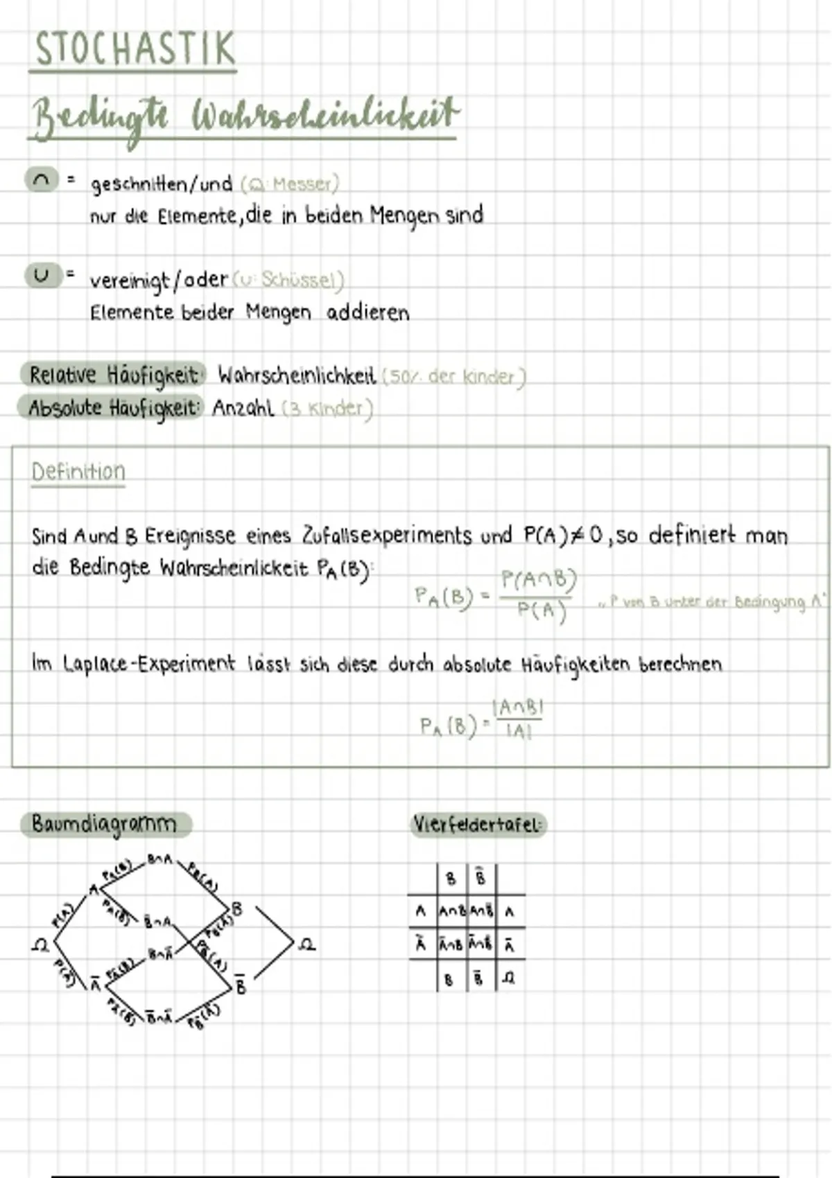 Lernzettel für Bedingte Wahrscheinlichkeit mit Relativer, Absoluter Häufigkeit mit Einbeziehung von Vierfeldertafeln, Baumdiagrammen, und Definition.