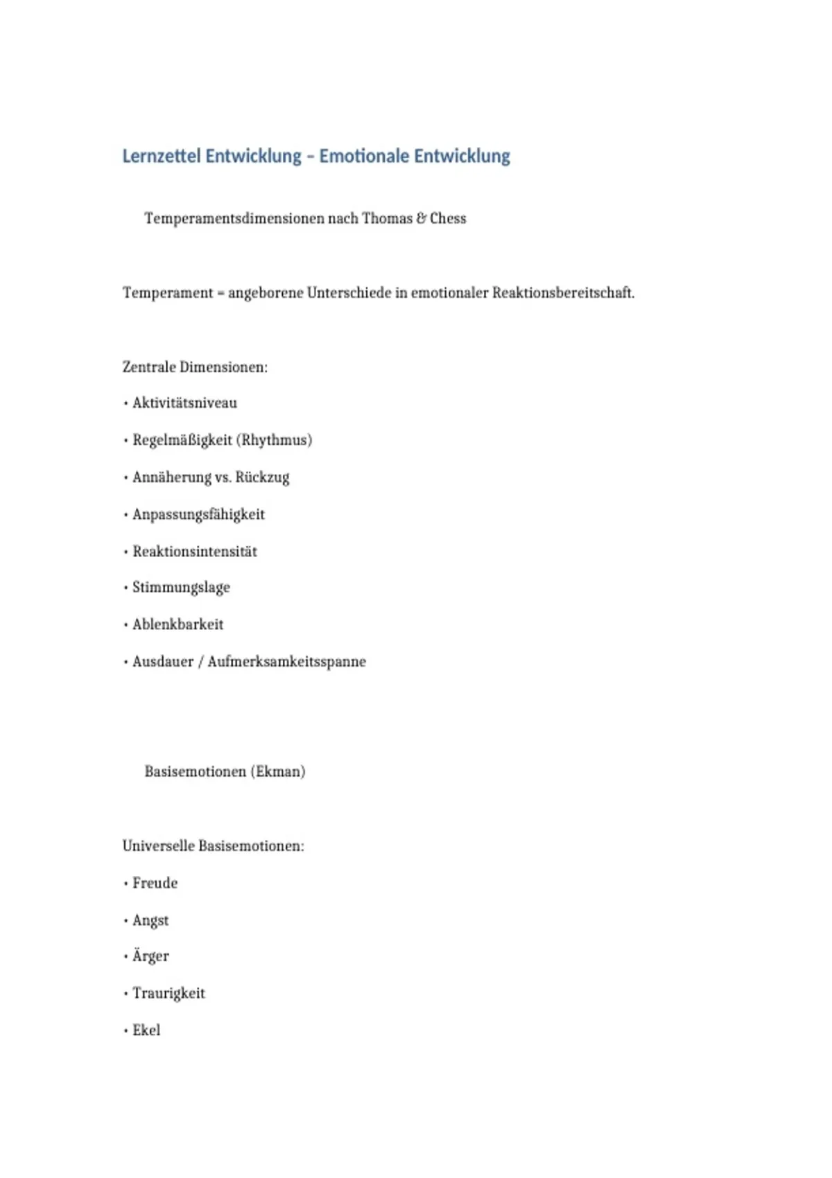 Zusammenfassung Lernzettel Entwicklungspsychologie Emotionale Entwicklung